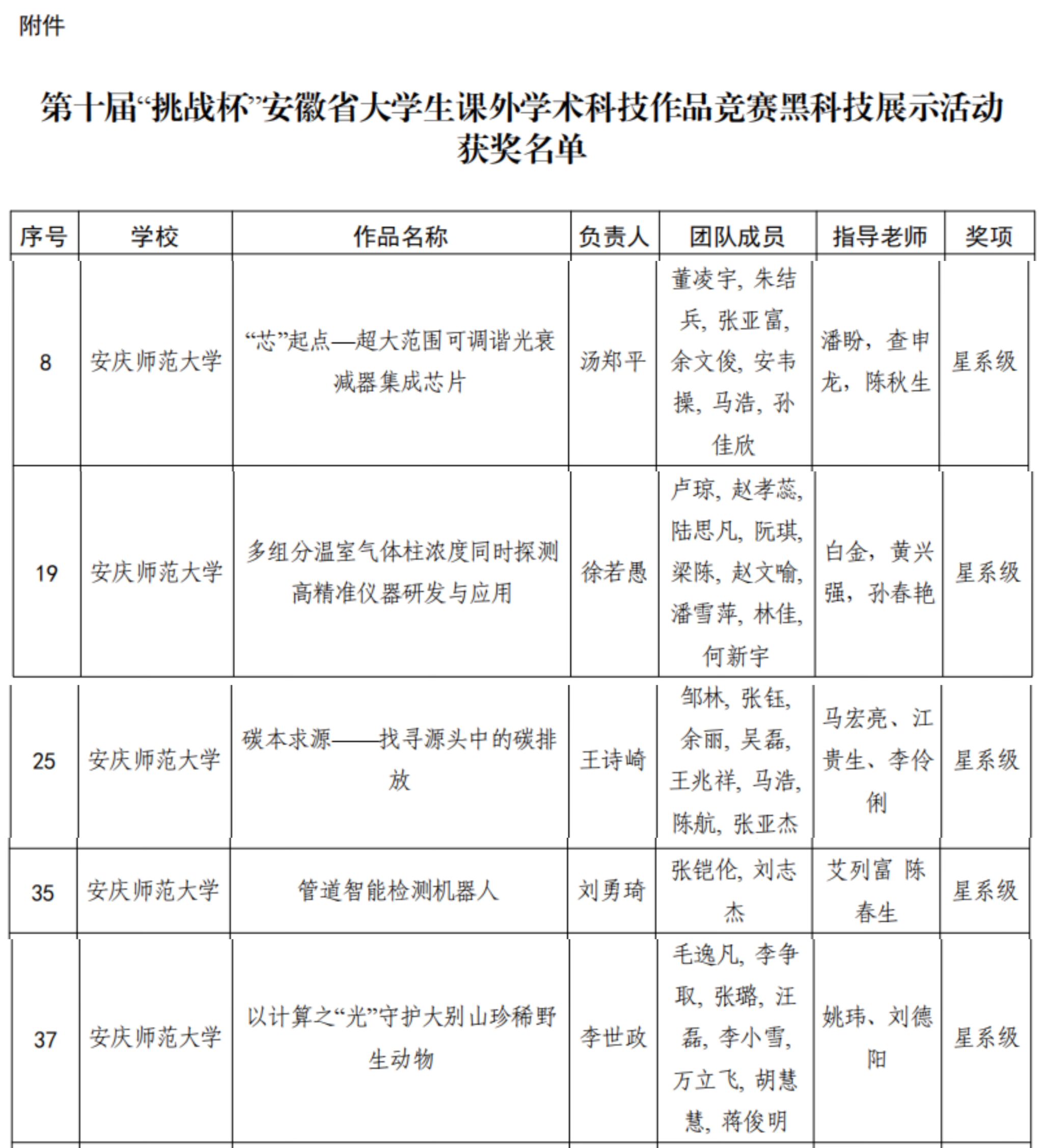 近日,第十届“挑战杯”安徽省大学生课外学术科技作品竞赛“黑科技”专项赛评审结果揭晓。beat365官网23项作品获奖,其中《“芯”起点—超大范围可调谐光衰减器集成芯片》《多组分温室气体柱浓度同时探测高精准仪器研发与应用》《碳本求源——找寻源头中的碳排放》《管道智能检测机器人》《以计算之“光”守护大别山珍稀野生动物》等5项作品获评“星系级”(最高奖项,全省共43项),最高奖项获奖成绩并列全省高校第二,获奖等级和数量取得新突破。