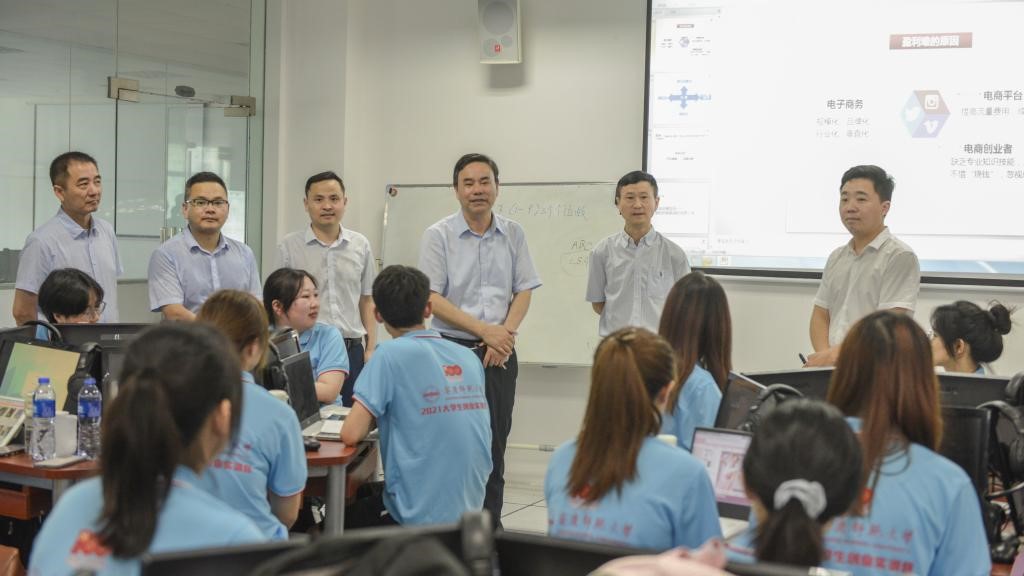 吴照明察看了网创实训班的《电商创业路径》和SIYB《实训游戏》授课情况,与授课教师、参训学员进行了交流,了解了实训营类型、课程开设以及参训学员生活保障等方面的情况。吴照明指出,创业实训营活动非常有意义,课程体系完整、内容丰富、形式多样,不仅有利于增强学生的创新创业意识,提高学生的创新创业能力,而且有助于提高学生的实践能力和综合素质。吴照明充分肯定了活动主办和承办部门的组织工作,对授课老师辛勤付出表示慰问和感谢。吴照明要求,参与实训的同学要珍惜机会,认真参与学习和实践,相关学院和部门要做好学生的安全管理和后勤保障工作,确保实训活动顺利完成,取得预期成效。