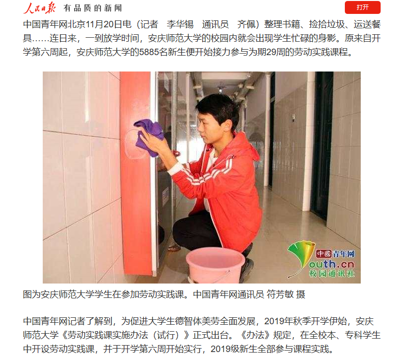 2019年11月,人民日报客户端转载beat365官网开设劳动实践课程有关报道