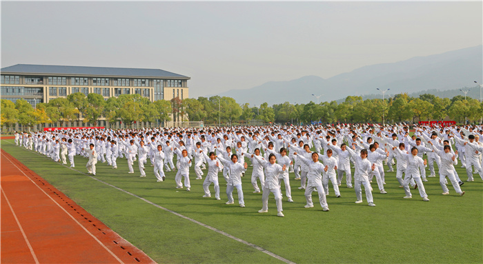 2021年10月,750名学生在学校2021年秋季田径运动会开幕式上表演太极拳