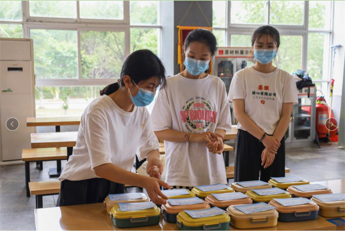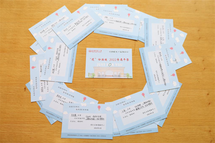 展现地域文化的家乡菜“毛血旺”、象征安庆本地特色的“山薯粉肉圆子”、标识“xxx同学,请查收专属午餐”的手写卡片……东苑食堂的餐桌上整齐摆放着装满各地家乡味道的保温盒,这样“四菜一汤”的私人套餐陆续被派送到学校各个学院的部分省外家庭经济困难学生手中。学生资助管理中心根据学生自拟的“菜单”,为他们定制了专属午餐。