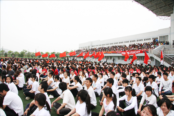 台上齐声欢唱,台下上几千名学生也都激动地打着节拍,每一曲终了,场上都响起热烈的掌声。在人群中不断爆发出的欢呼声里,十几名同学分别扛起党旗、国旗、团旗、校旗及各学院的院旗沿着塑胶跑道飞奔。塑胶运动场两边的看台上,挤满了15个学院的啦啦队,他们拉起横幅,为自己的学院呐喊鼓劲。五月的风中起伏着旗影、呐喊与激情。