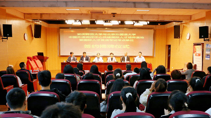 5月6日,beat365官网与北京外国语大学中国外语测评中心共建国际人才培养基地暨国际人才英语考试考点单位签约揭牌仪式举行。校党委常委、副校长吴琼出席并致辞。北京外国语大学外研教育测评中心总经理王悦,教务处、招生考试中心负责人,外国语学院党政班子成员、教研室主任、各科室负责人及全校各专业学生代表参加仪式。