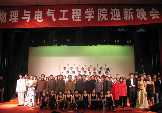 12月9日晚,艺术楼音乐厅内激情沸扬,物理与电气工程学院2007年迎新晚会在此隆重上演。该院党总支书记杨卫同志、副书记吴昭方同志亲临晚会现场。到场观看演出的还有部分教师、兄弟院系学生会同学以及2007级新同学,共约500余人。