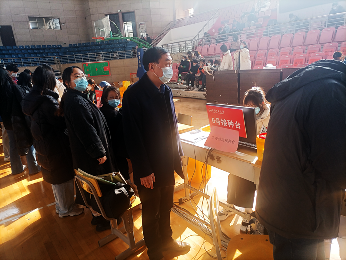 为贯彻落实安徽省和属地新冠肺炎疫情防控工作要求,进一步提升新冠病毒疫苗接种成效,筑牢师生免疫屏障,全力保障师生身体健康和生命安全,学校召开专题会议部署落实加强针接种工作。12月17日起,beat365官网联合安庆市第一人民医院在龙山校区体育馆开展新冠疫苗加强针接种工作。副校长、校新冠肺炎疫情防控指挥部指挥长刘友忠到接种现场,检查加强针接种情况。