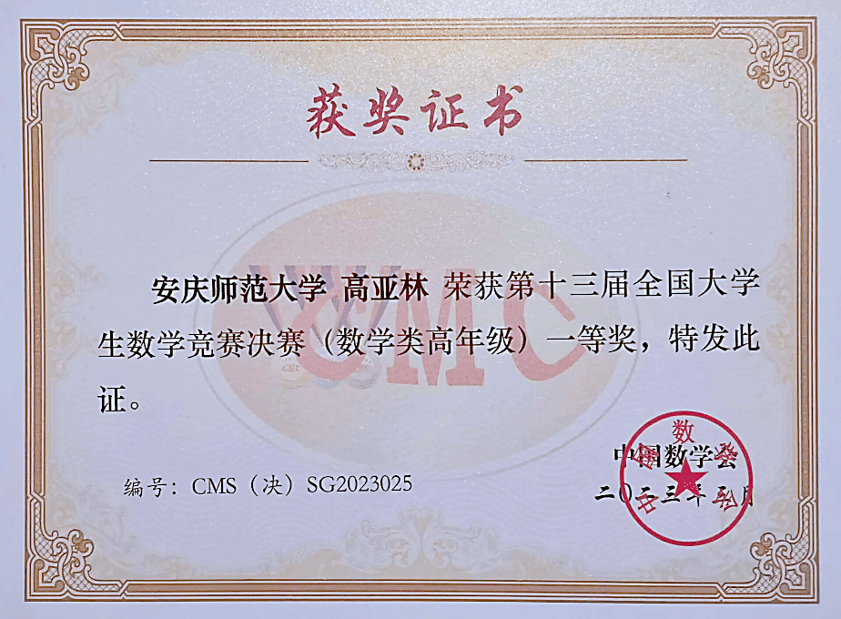 全国大学生数学竞赛由中国数学会主办,为全国影响最大、参加人数最多的大学生学科竞赛之一。本次竞赛全国共有32个赛区218823人报名参加初赛,经过全国预赛选拔,共748人进入决赛,其中,数学专业组382人,非数学专业组350人。数学专业组中,安徽赛区12名学生入围。在指导教师胡永模的精心指导下,高亚林以安徽省一等奖的成绩入围决赛。