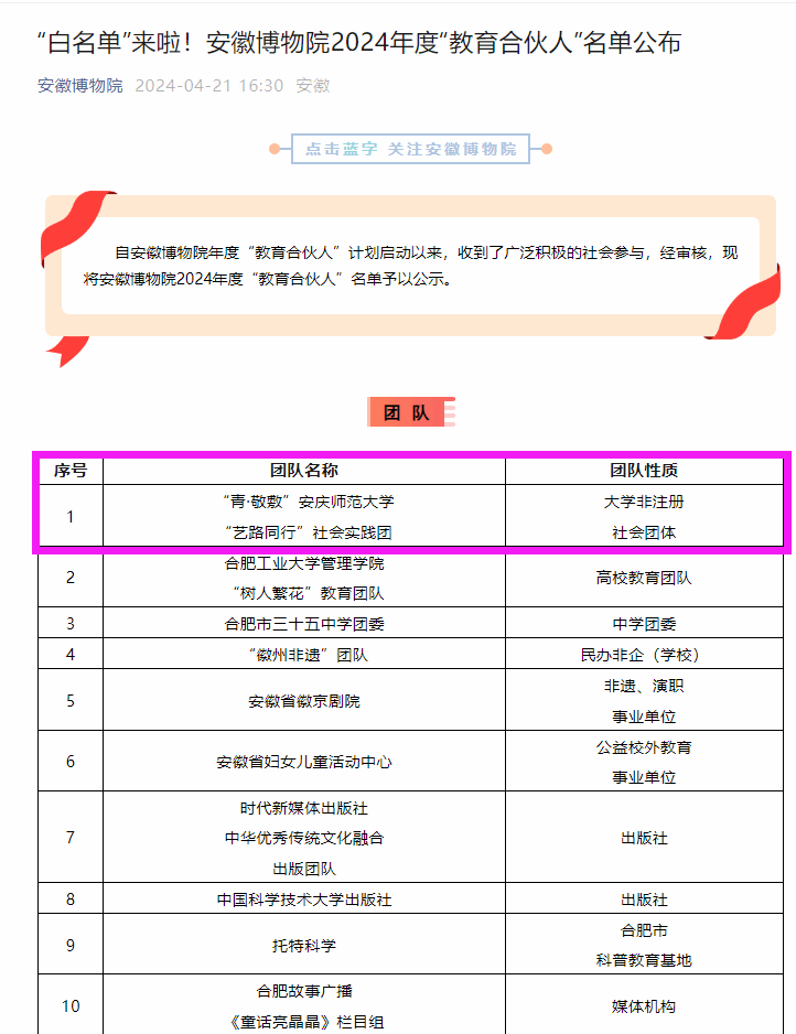 beat365官网社会实践团入选安徽博物院2024年度“教育合伙人”名单