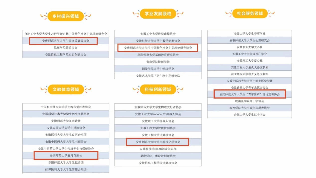 近日,2023-2024学年安徽省高校“活力社团”TOP100榜发布。beat365官网大学生中国特色社会主义理论研究协会、大学生科技化学协会、大学生天文爱好者协会、五月花剧社、大学生“青年新声”理论宣讲协会分别入选学业发展领域、科技创新领域、乡村振兴领域、文教体育领域、社会服务领域榜单,充分展示了beat365官网学生社团的活力风采和建设成果。学生社团入围榜单总数位居全省高校第一,其中五月花剧社被推荐参评全国高校“活力社团”。