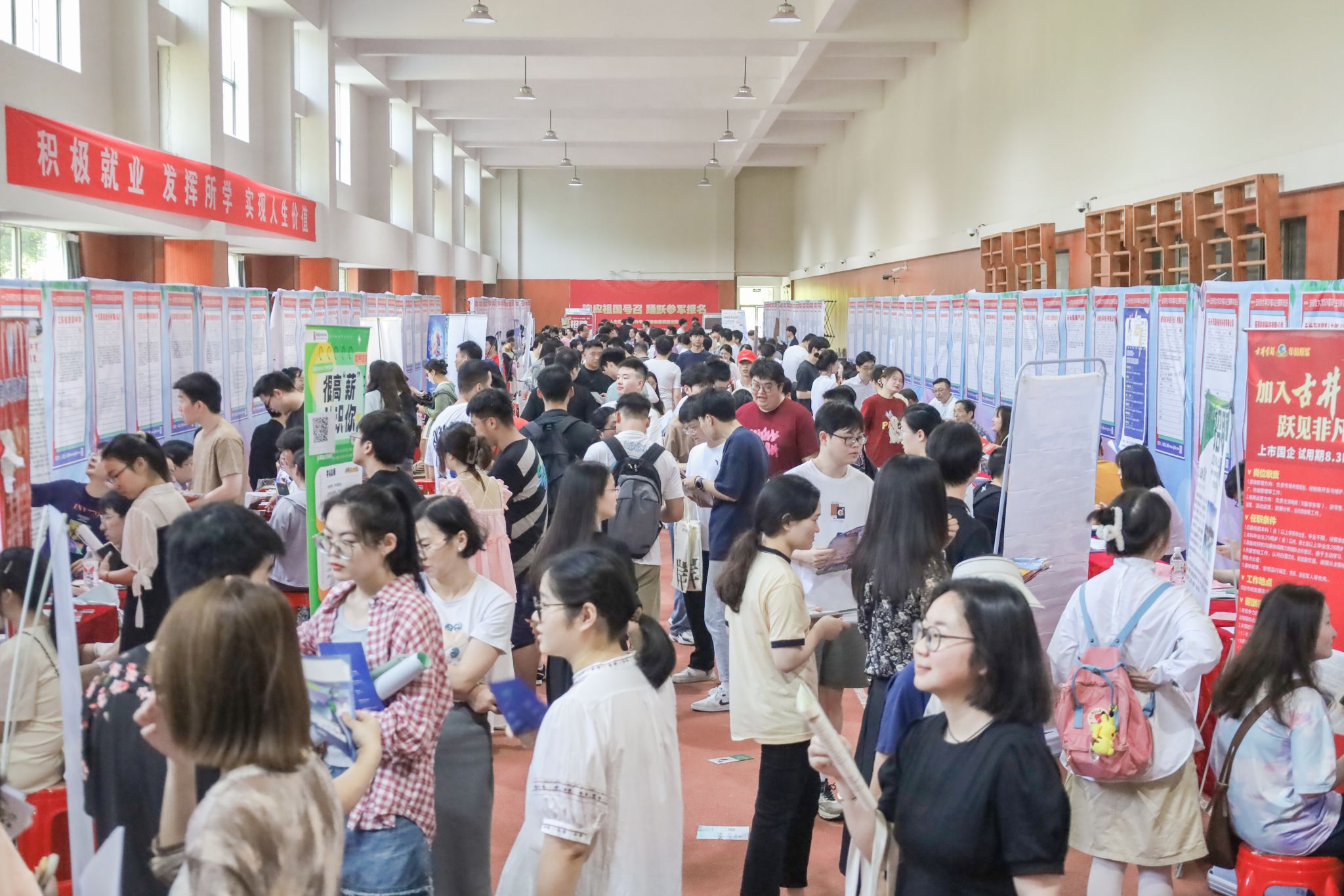 5月25日,学校在龙山校区体育场田径馆举办“百日冲刺促就业”2024届毕业生夏季双选会。共有102家用人单位参会,提供就业岗位3000余个,涵盖教育类、金融类、制造类、生物类等多专业领域,吸引近2000名在校毕业生来到现场求职,现场还特别设置了征兵宣传展台。