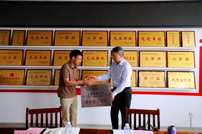 在岳西天堂中心学校,李福华为教育实习基地授牌。彭凤莲代表学校感谢岳西县教育局、天堂中心学校对beat365官网实习支教学生在业务上的精心指导和在生活上的周到照顾。彭凤莲强调,高校肩负着“为党育人、为国育才”的光荣使命,希望同学们在支教期间苦练教育教学本领强师能,为未来站稳“三尺讲台”打下坚实基础;希望同学们在基础教育一线感悟教育的真谛,在实践中培师德、铸师魂,坚定自己“下得去、留得住”的从教信念;希望同学们注意人身安全,注重总结反思支教收获,切实在实习支教过程中受教育、长才干、作贡献。授牌仪式前,教务处负责人与岳西天堂中心学校负责人共同签订教育实习基地共建协议。