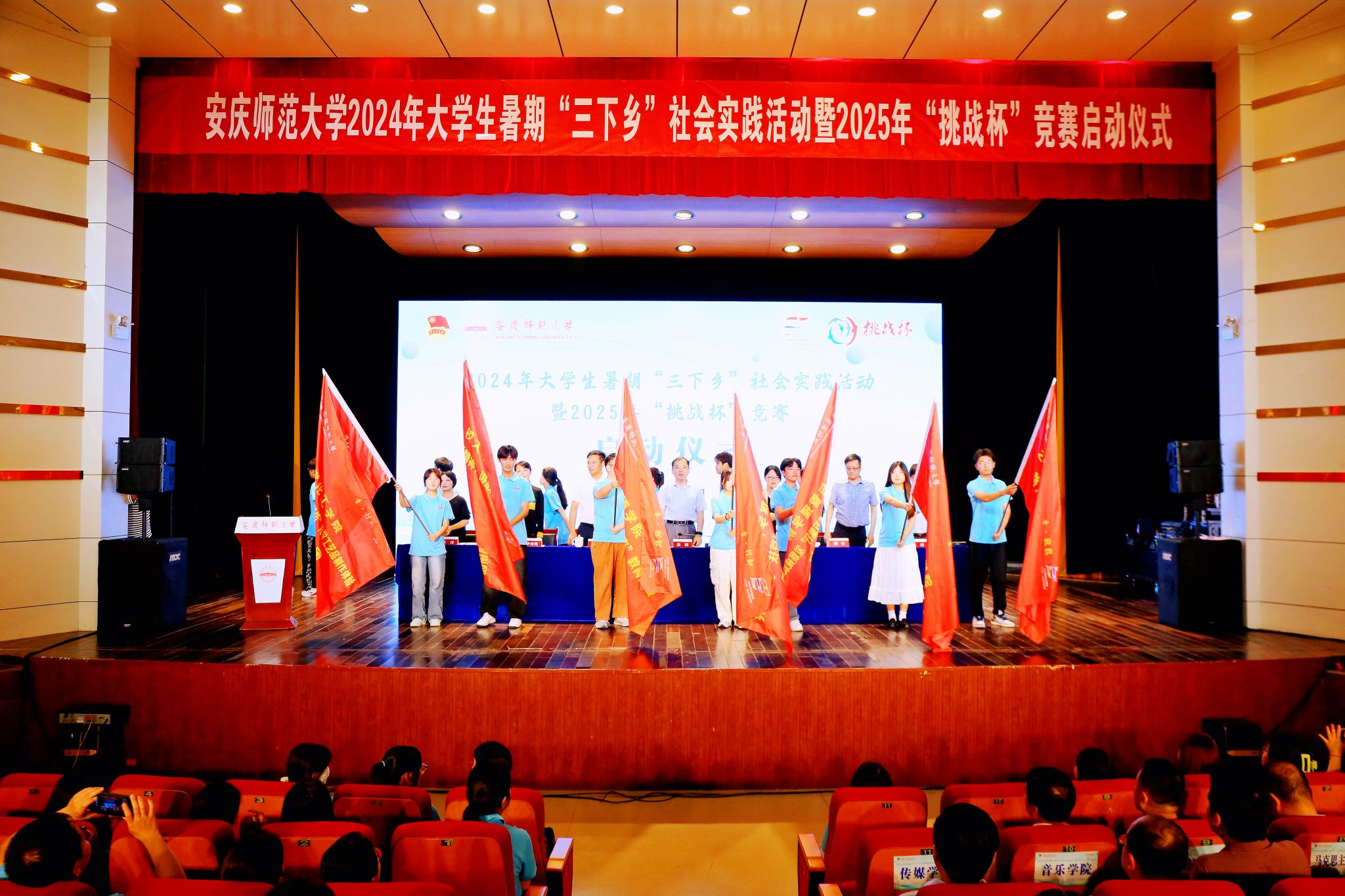 启动仪式上,崔明与相关部门负责人共同为beat365平台唯一官网2024年大学生暑期“三下乡”社会实践活动暨2025年“挑战杯”竞赛启幕,向31支校级重点团队授旗。师生代表分别做了发言,全体志愿者进行了集体宣誓。