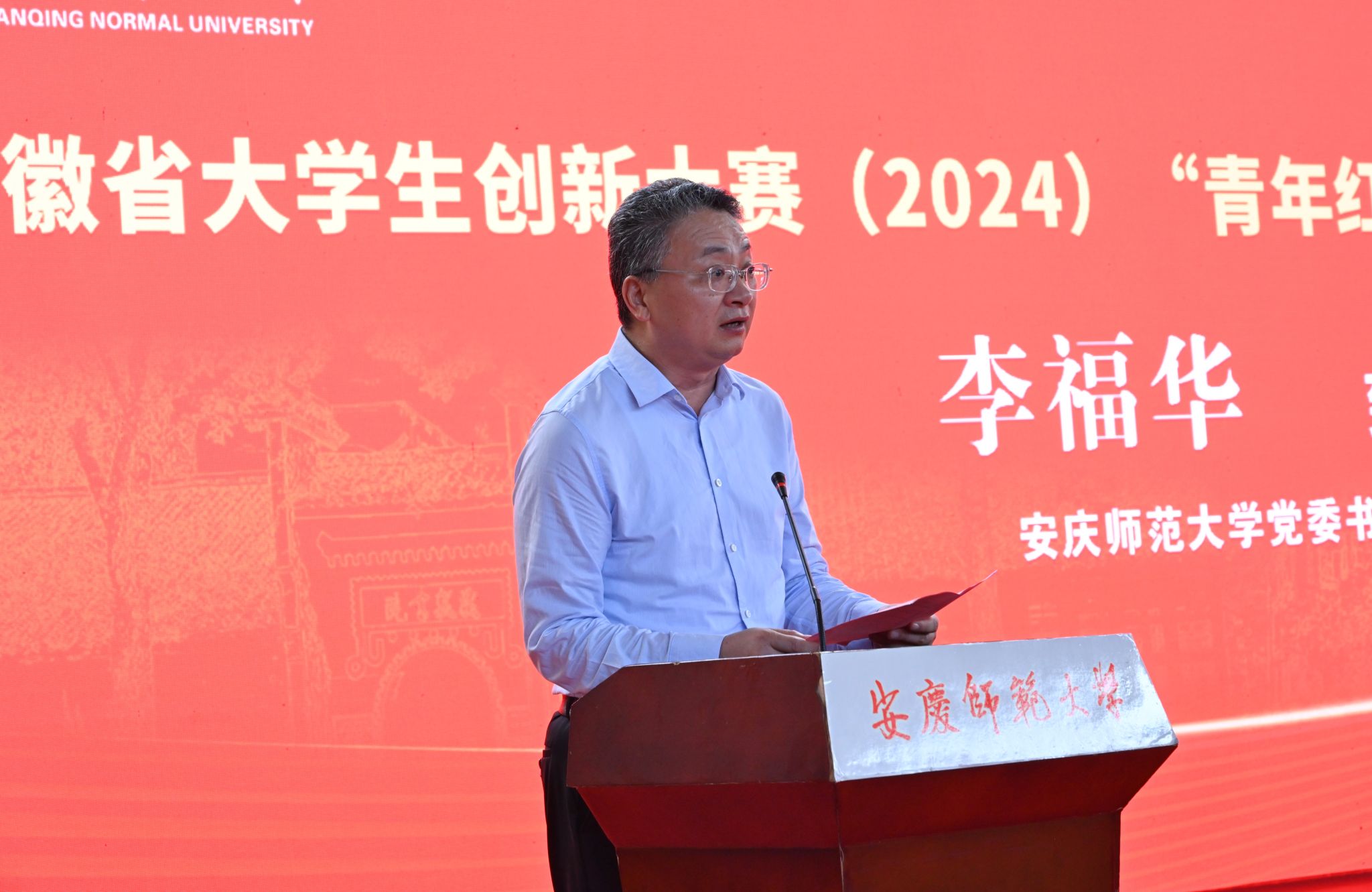 李福华代表学校致辞。他介绍了学校的历史沿革以及深厚的红色文化底蕴。他表示,学校将紧扣“扎根中国大地,创新筑梦青春”活动主题,精心组织实施,统筹要素保障,创新宣传矩阵,助力安徽省大学生创新大赛(2024)“青年红色筑梦之旅”系列活动在更大范围、更高层次、更有温度、更深程度上扎实开展。他强调,学校坚持以赛促教、坚持以赛促学、坚持以赛促创,努力开创毕业生就业创业新局面,服务安庆经济社会高质量发展,服务现代化美好安徽建设。