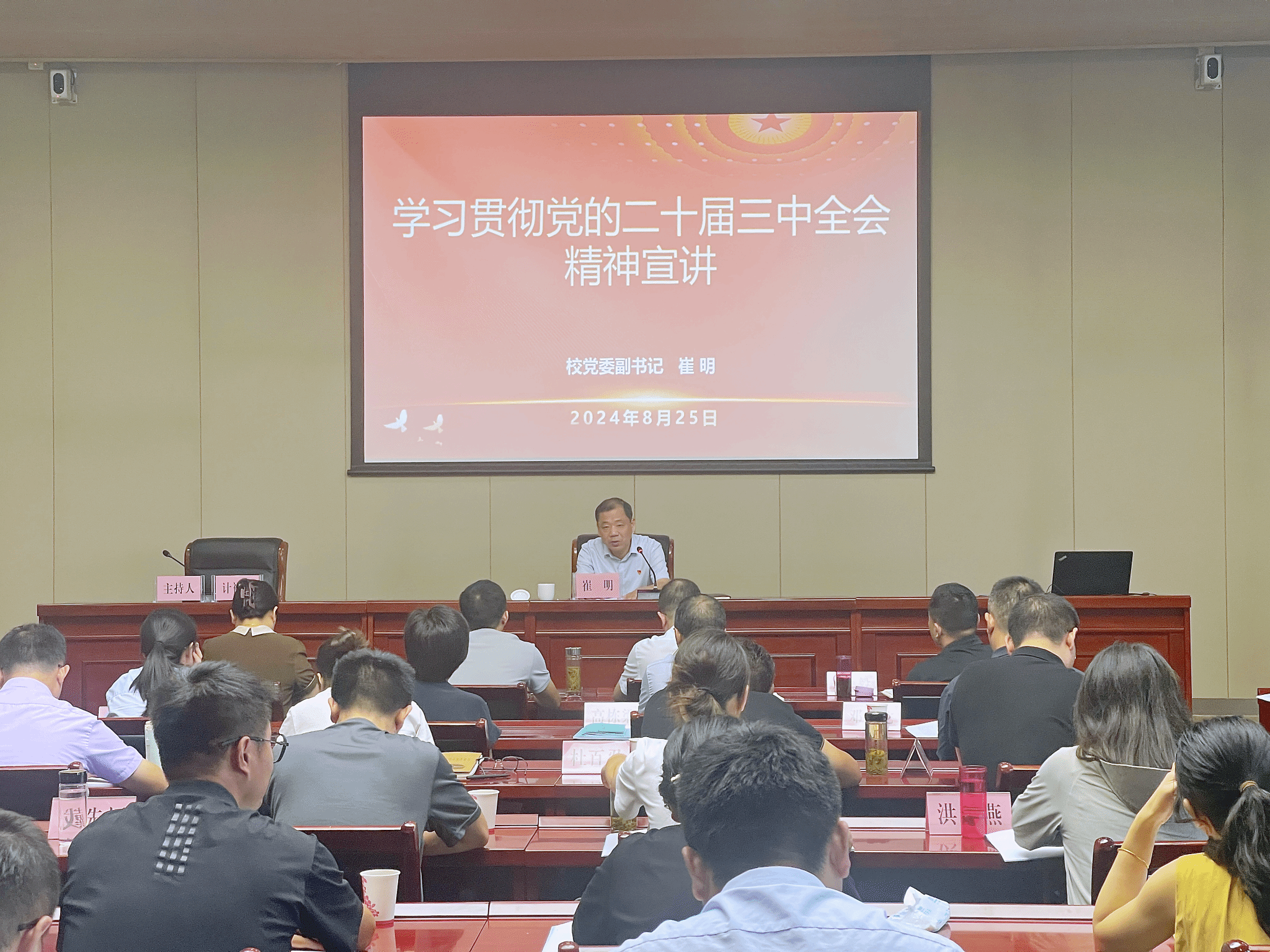 崔明从深刻认识党的二十届三中全会的重大意义、深入学习领会习近平总书记在全会上的重要讲话精神、全面准确理解进一步全面深化改革重大举措、全力以赴抓好全会精神贯彻落实等方面,结合学校发展实际对党的二十届三中全会精神作了系统宣讲和阐释。他对本次培训成效给予充分肯定,希望全校党务工作者要筑牢信仰之基,自觉做党的创新理论的笃信笃行者,把学习贯彻习近平新时代中国特色社会主义思想和党的二十届三中全会精神作为首要政治任务,坚持不懈用党的创新理论凝心铸魂,不断筑牢信仰之基、补足精神之钙、把稳思想之舵,切实提升马克思主义理论水平和运用能力,紧密结合新时代新实践,不断提升学习的力度、广度、深度,以理论学习的成效筑牢政治忠诚的基石。要积极履职尽责,自觉做基层组织建设的优秀实践者,要有“守土有责、守土尽责”的意识和“功成不必在我、功成必定有我”的境界,要杜绝“差不多”“过得去”的思想,紧紧抓住“增强基层党组织政治功能和组织功能”这条主线,下大力固根基、扬优势、补短板、强弱项,将复杂繁冗的工作做到精益求精,推动基层党建工作取得新成效,开创新局面。要坚持开拓进取,自觉做勇于担当作为的不懈奋斗者,牢固树立正确的政绩观,求真务实,扎实工作,把扛重活、打硬仗作为锻炼成长、锤炼本领的重要途径,在知重负重中磨砺干事成事的硬功夫,深入学习贯彻习近平总书记关于全面深化改革的一系列新思想、新观点、新论断,努力在推动学校各项事业改革创新中闯出新路子,在推进特色鲜明的高水平大学建设向应用型深度转型中展现新作为、彰显新担当。