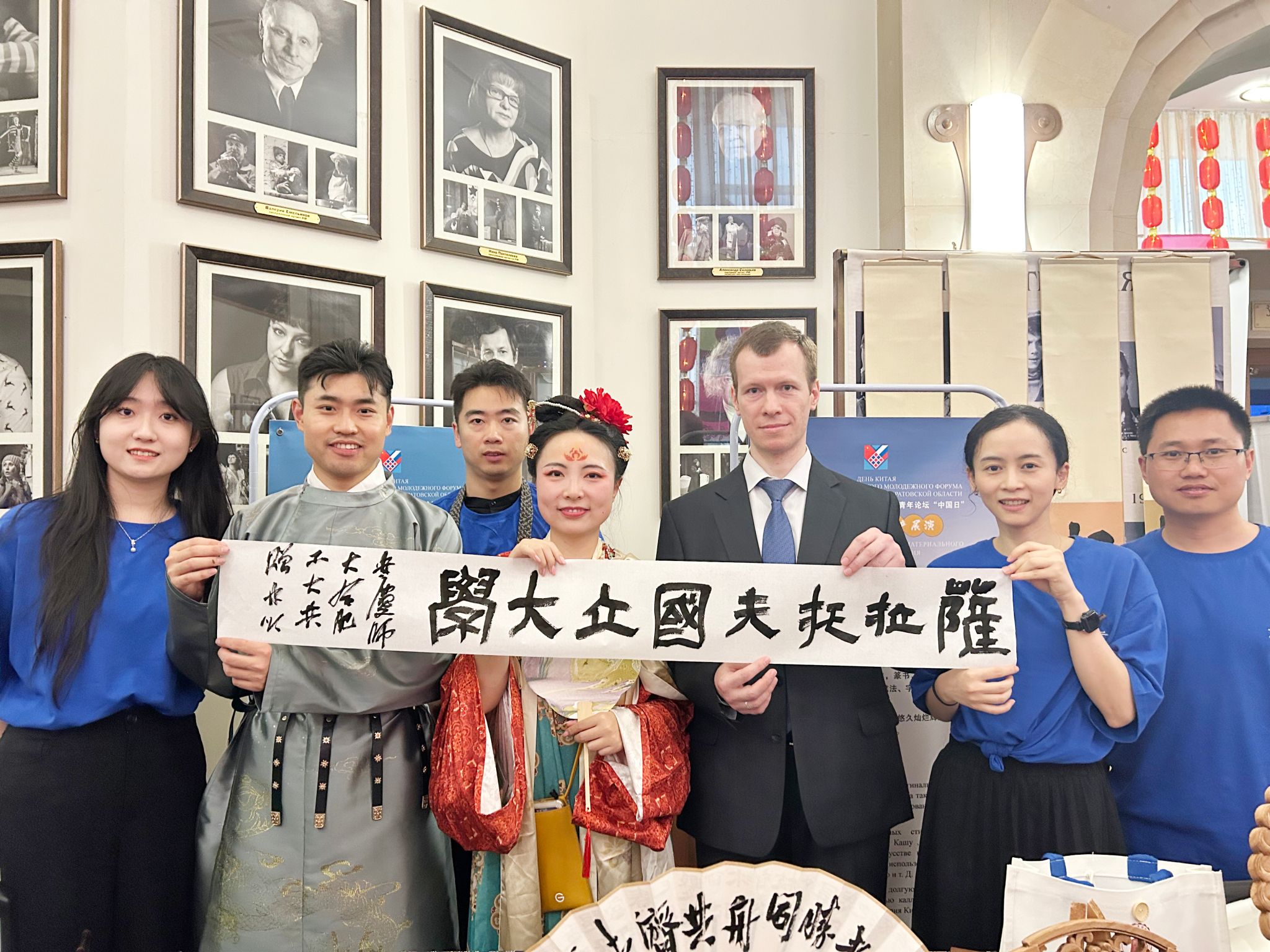 在开幕式和“中国日”活动上,beat365官网音乐学院教师程睿、张召兴表演双人舞《安徽花鼓灯小花场》,热情奔放、敏捷优美地展示出安徽民间艺术风格和地方舞曲特色;黄梅剧艺术学院师生刘丽和方梦婷进行了精彩的黄梅戏表演《打猪草》,将传统非遗剧种的魅力充分展现;美术学院教师杨林顺进行了“文房四宝”以及现场书法展示,现场教授俄罗斯青年书法创作,以书法文化的方式再一次将中国传统优秀文化的魅力呈现在俄罗斯青年面前。