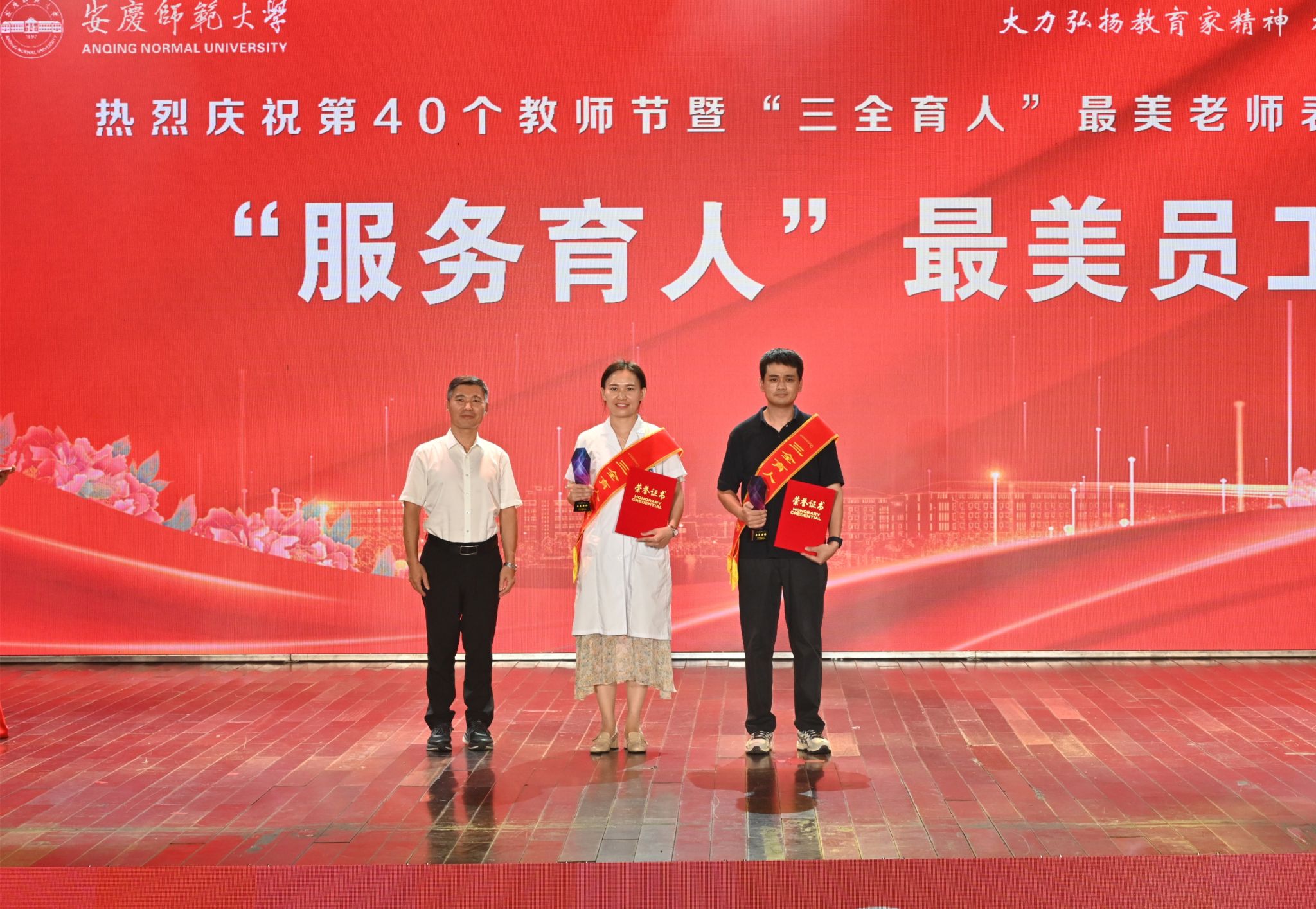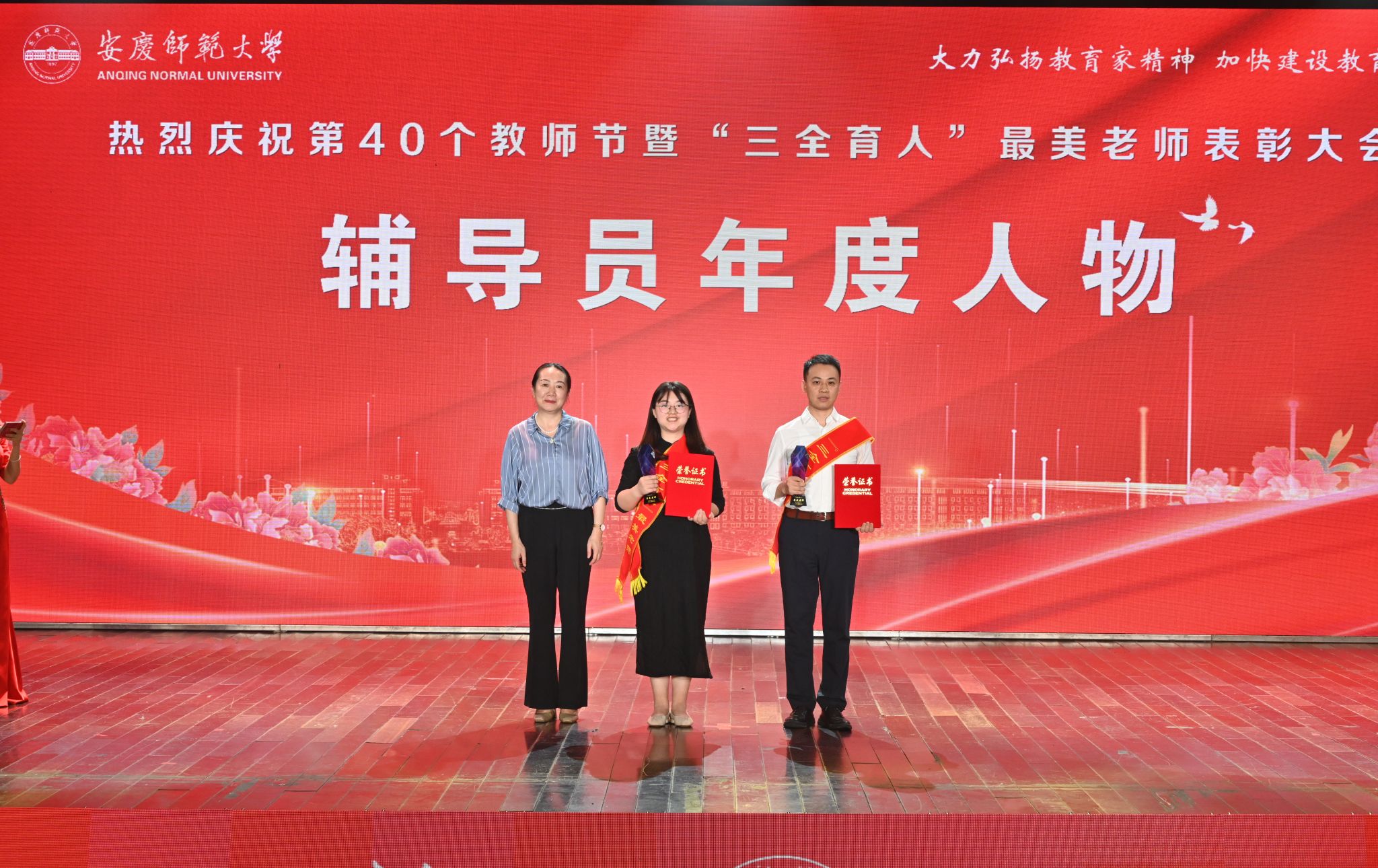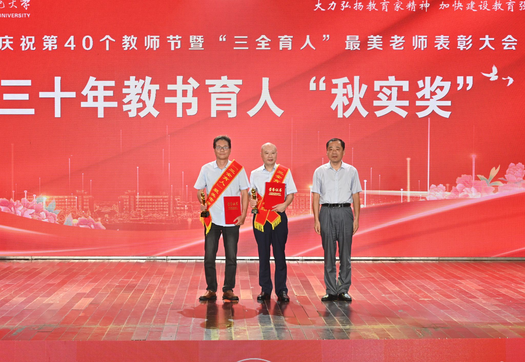 三十年教书育人“秋实奖”获得者吴甘霖、董根明,“教书育人”最美老师叶仁玉、张文、张传磊、胡小兵、黄先军,“科研育人”最美老师毛晓霞、彭长生,“辅导员年度人物”李俊、张沐阳,“管理育人”最美老师邹斌、戴传红,“服务育人”最美员工丁青、何营等15位教师在会上受到表彰,校领导为获奖教职工颁发了奖杯和荣誉证书。