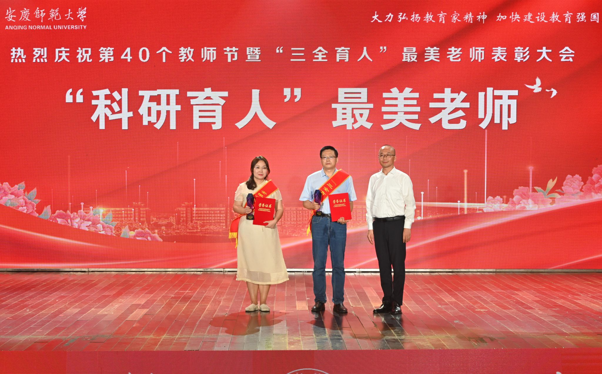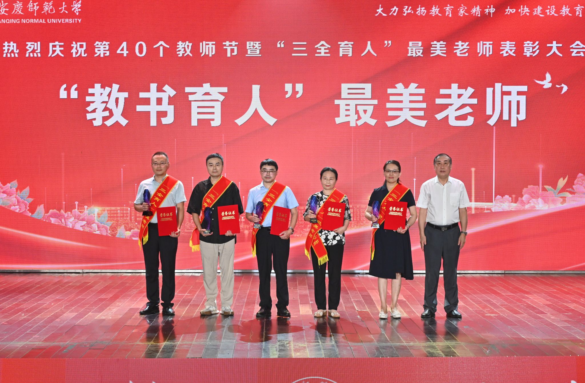 会场气氛隆重热烈,颁奖词铿锵有力。“三十年光阴磨一剑,青丝白发终无悔;三十年身心献杏坛,春华秋实满庭芳;他是耕耘者,大力弘扬教育家精神;他是奋斗者,共同建设现代化强国;敬敷世范,传道授业多建树;勤学笃行,修德正风铸师魂。”时时响起的热烈掌声是对优秀教师的敬意和赞许。