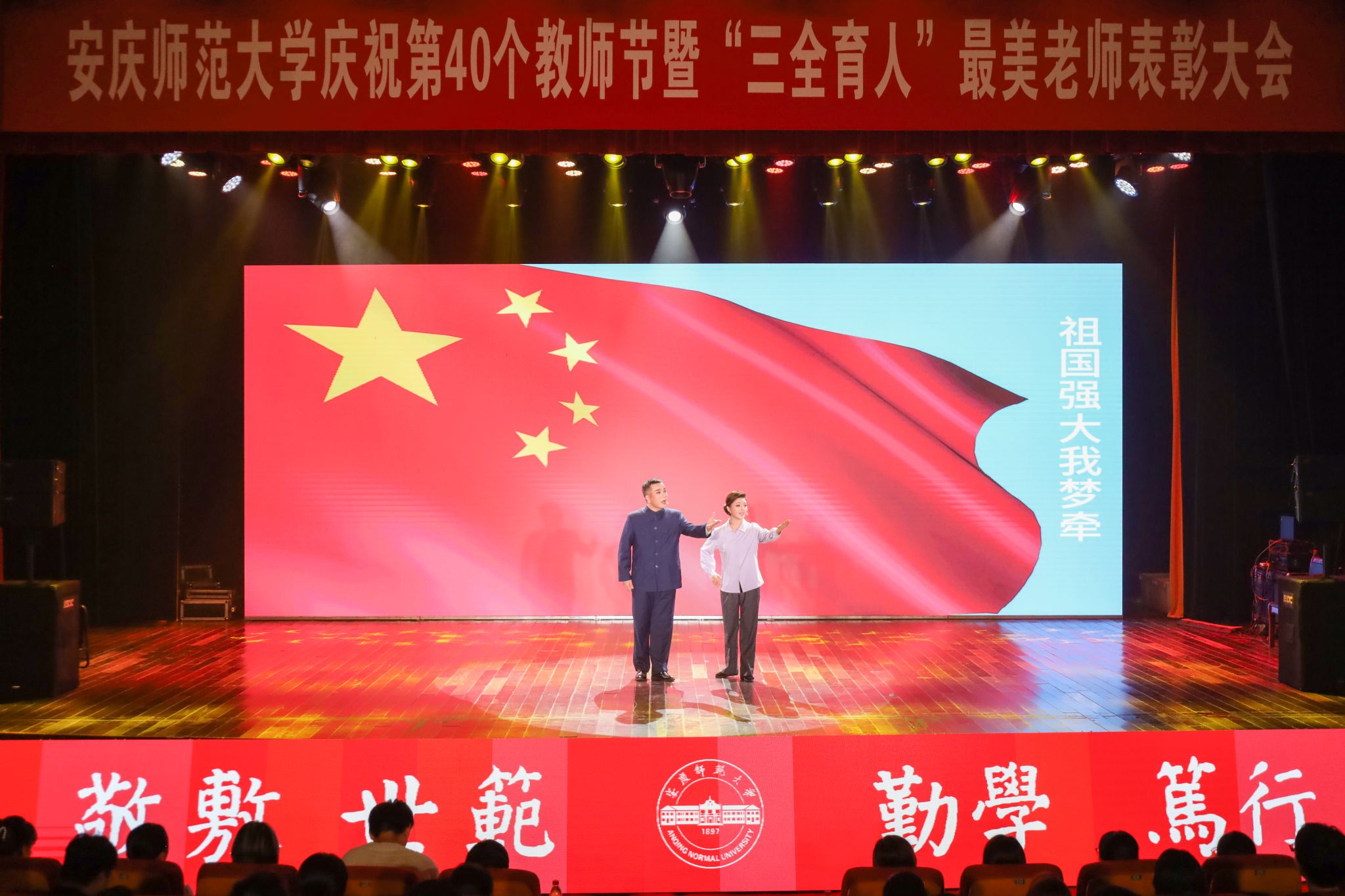 开场节目黄梅大鼓《黄梅戏情代代传》,呈现了韩再芬等一批黄梅戏艺术家们锲而不舍的改革与创新实践,激励全体师生乘势而上,奋发勇为。黄梅戏《邓稼先》选段“祖国强大我梦牵”,展现了邓稼先先生对祖国的深情厚意和对科学事业的执着追求,现场师生深受感动、备受激励。歌伴舞《老师我总是想起你》,深情讴歌了教师敬业爱生、无私奉献的精神。