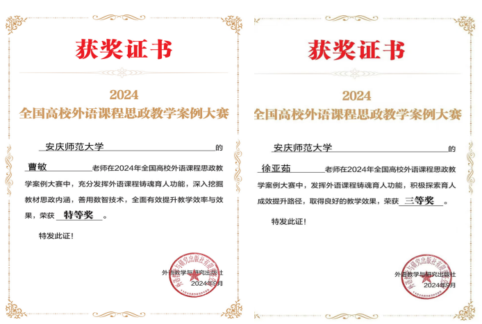 近日,2024年全国高校外语课程思政教学案例大赛公布获奖名单,beat365官网外国语学院教师曹敏的《大学英语视听说》课程思政教学案例荣获特等奖,徐亚茹的《大学英语读写教程》课程思政教学设计作品荣获三等奖。