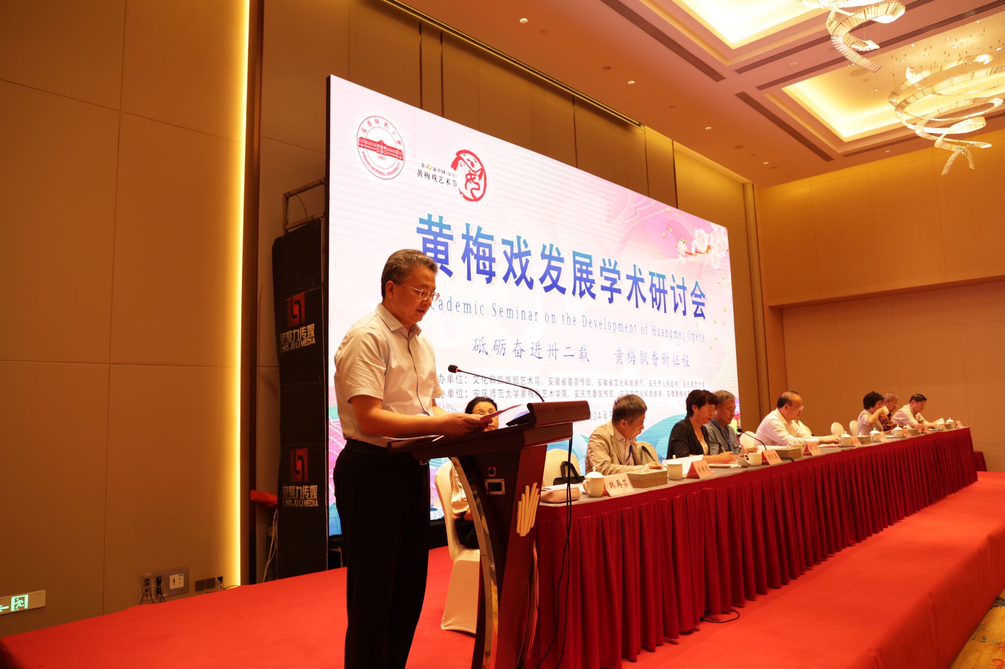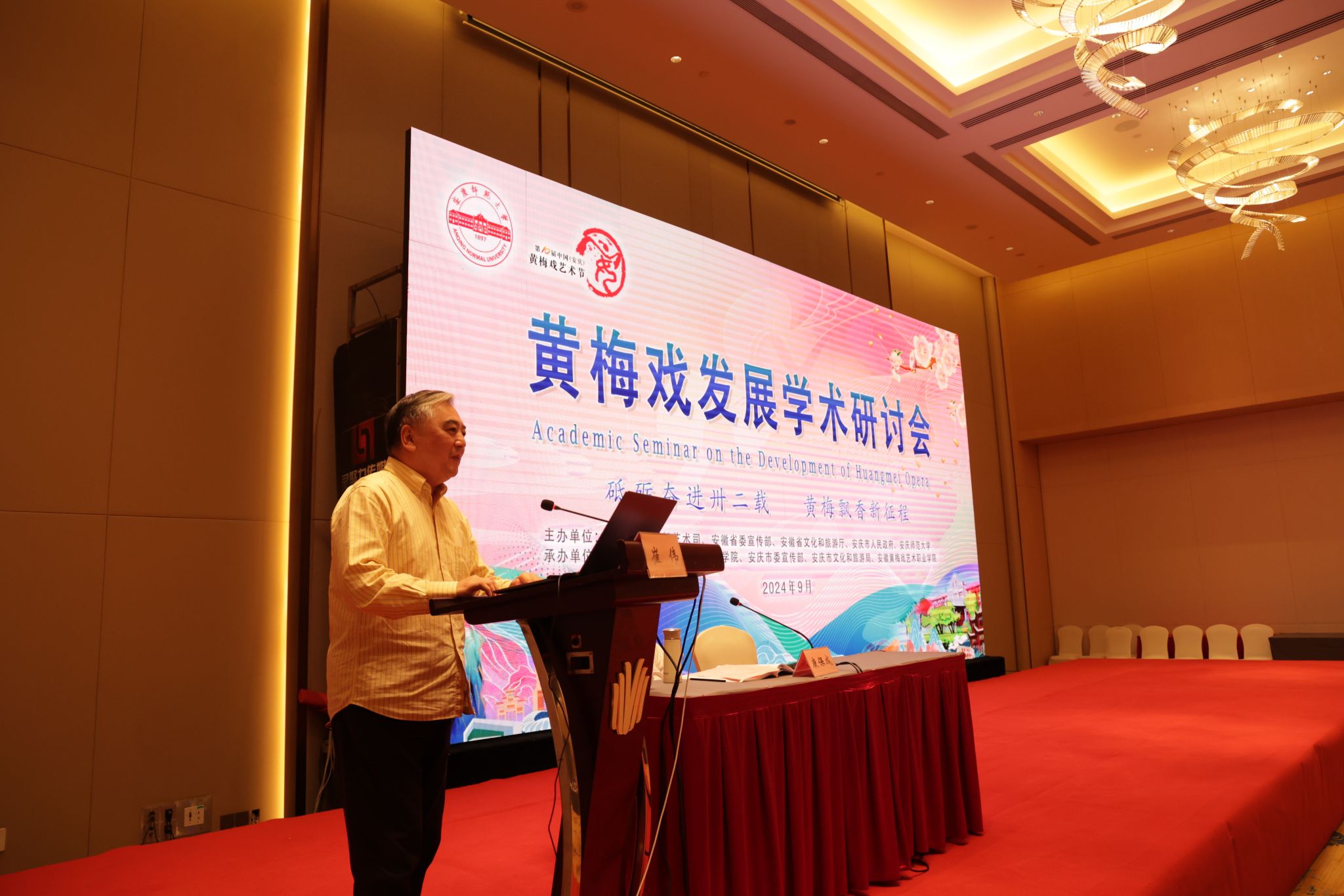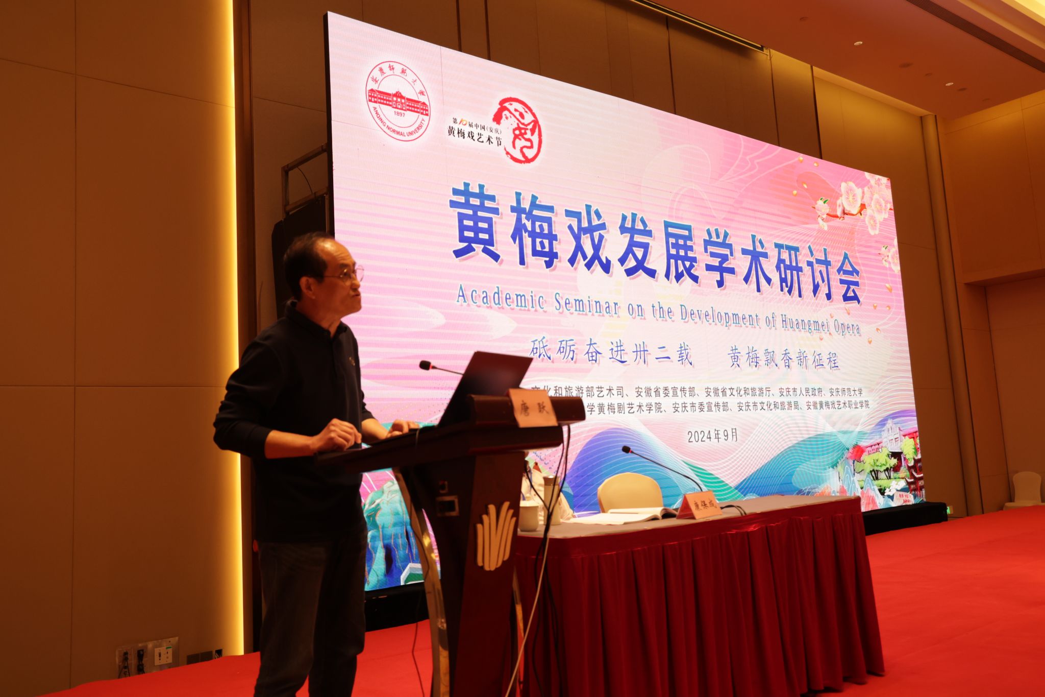 9月22日至23日,学校举办数字时代黄梅戏保护传承国际学术研讨会。安徽省政协副主席、安庆市委书记张祥安,中国戏剧家协会原秘书长崔伟,上海戏剧学院原院长、中国戏剧家协会原副主席韩生,校党委书记李福华、校长彭凤莲,安庆市委常委、宣传部部长王爱武,安徽省文旅厅原副厅长唐跃,中国戏剧家协会副主席、黄梅剧艺术学院院长韩再芬等出席开幕式。彭凤莲主持开幕式,张祥安宣布学术研讨会开幕。来自新加坡、马来西亚以及国内40余所高校、研究院所、戏曲院团100余位专家学者,学校相关职能部门负责同志,黄梅剧艺术学院及相关学院师生代表参加研讨会。