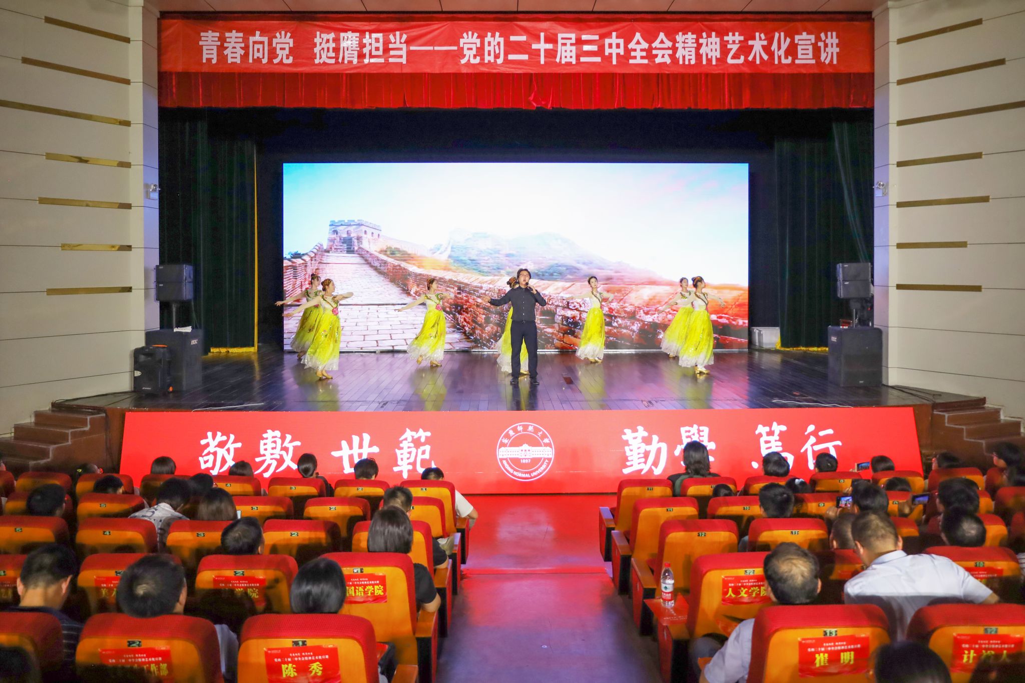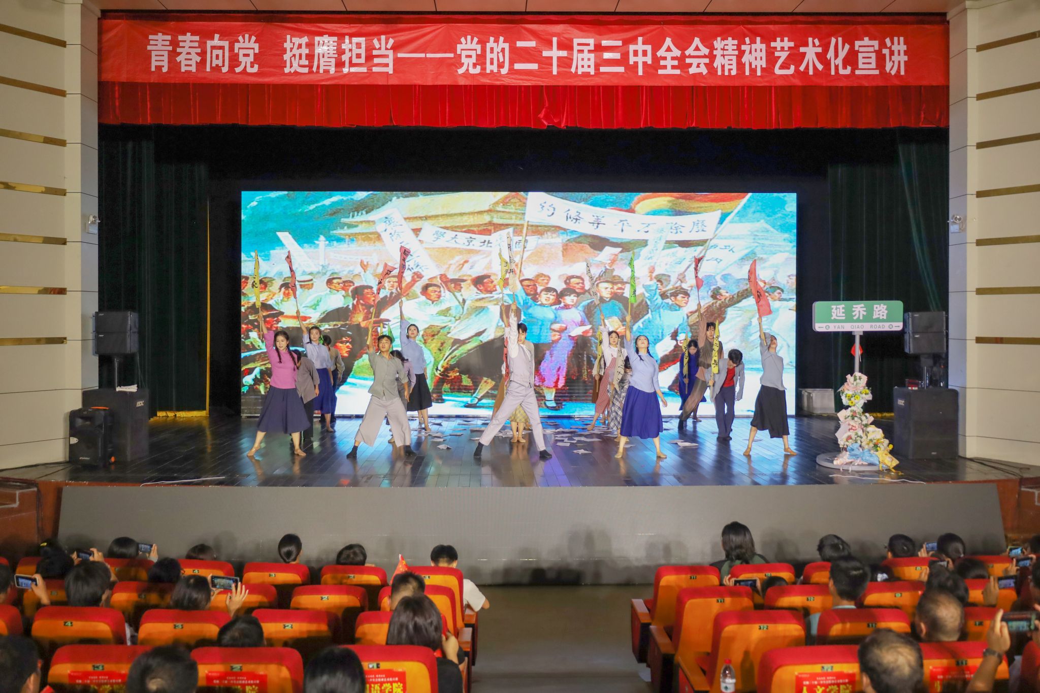 9月29日,学校举办学习贯彻党的二十届三中全会精神艺术化宣讲,校党委副书记崔明,校党委常委陈秀、计裕人出席活动。各院级党组织负责人,党委学工部、党委研工部、校团委负责人及教师代表、学生代表参加活动。
