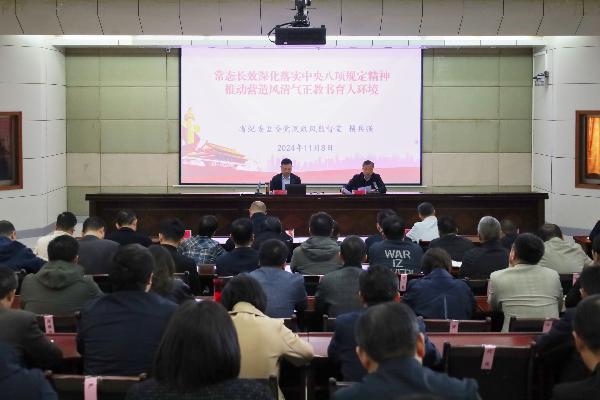 报告会上,赖兵强以“常态长效深化落实中央八项规定精神 推动营造风清气正教书育人环境”为题,围绕“深入学习贯彻习近平总书记关于作风建设的重要论述,查处违反中央八项规定精神问题有关说明,省属高校系统贯彻落实中央八项规定精神的总体态势及突出问题表现,查处享乐主义奢靡之风有关政策规定以及对省属高校落实中央八项规定精神、纠治“四风”工作的几点建议”等方面,对如何把握作风建设新形势新任务新要求、贯彻落实中央八项规定精神进行了全面解读和辅导。报告紧密联系全省教育系统和高校实际,通报了省属高校大量违纪违法典型案例,主题鲜明、内容丰富,对学校深入推进党风廉政建设和纪律作风建设具有很强的针对性和指导性。