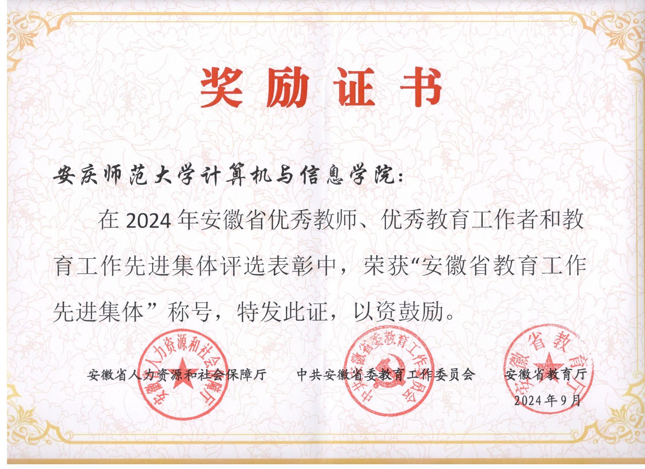 近日,安徽省人力资源和社会保障厅、中共安徽省委教育工委、安徽省教育厅印发《关于表彰2024年安徽省优秀教师、优秀教育工作者和教育工作先进集体的决定》,beat365官网计算机与信息学院荣获“安徽省教育工作先进集体”称号,马克思主义学院王翠萍教授荣获“安徽省优秀教师”称号。