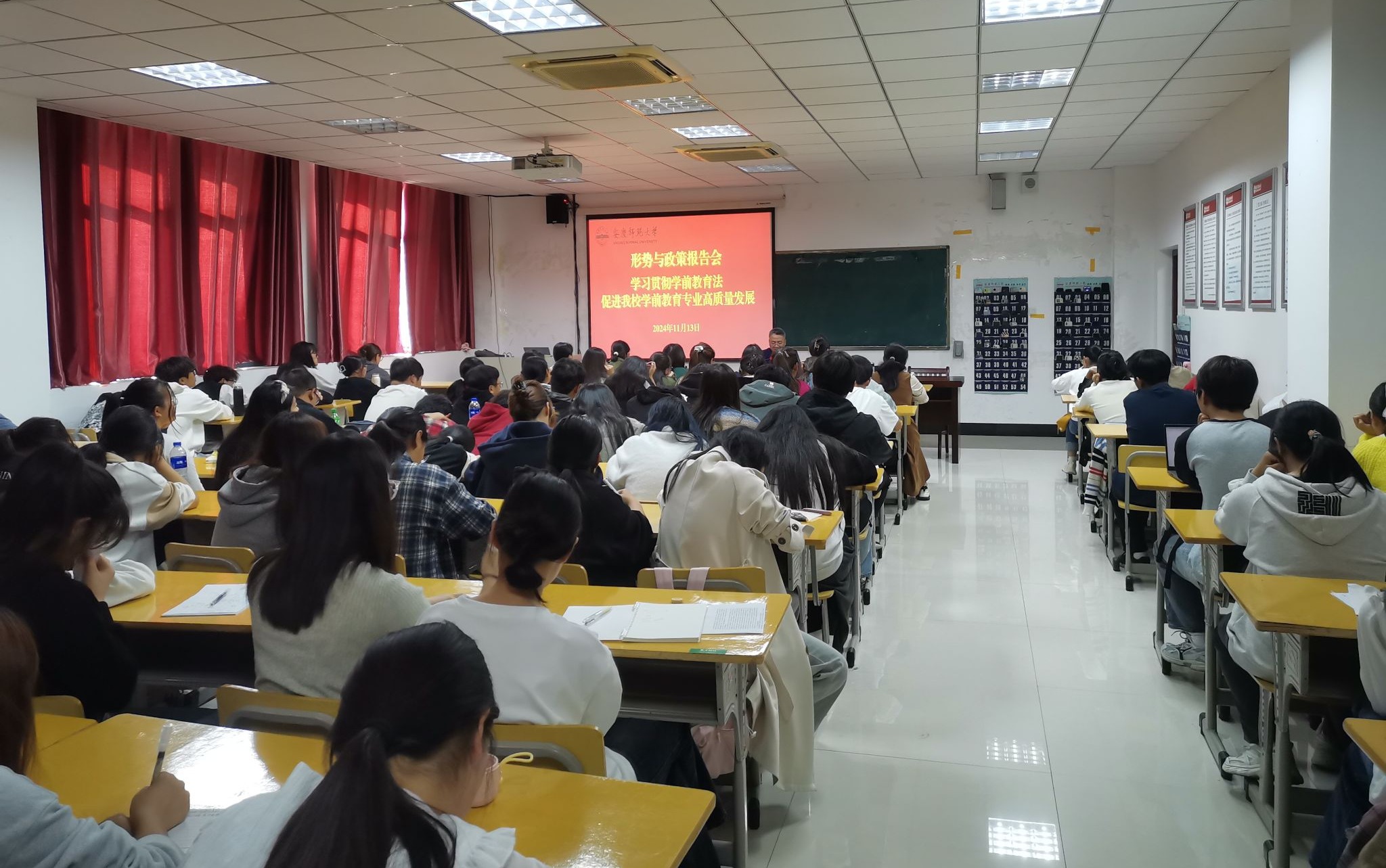 11月13日,校党委书记李福华为教育科学学院师生作《学习贯彻学前教育法,促进beat365官网学前教育专业高质量发展》的形势与政策报告,深入学习贯彻党的二十大和二十届二中、三中全会精神,贯彻落实习近平总书记关于教育的重要论述和全国教育大会精神,学习宣传学前教育法,推动学前教育专业认证专家反馈问题整改工作。