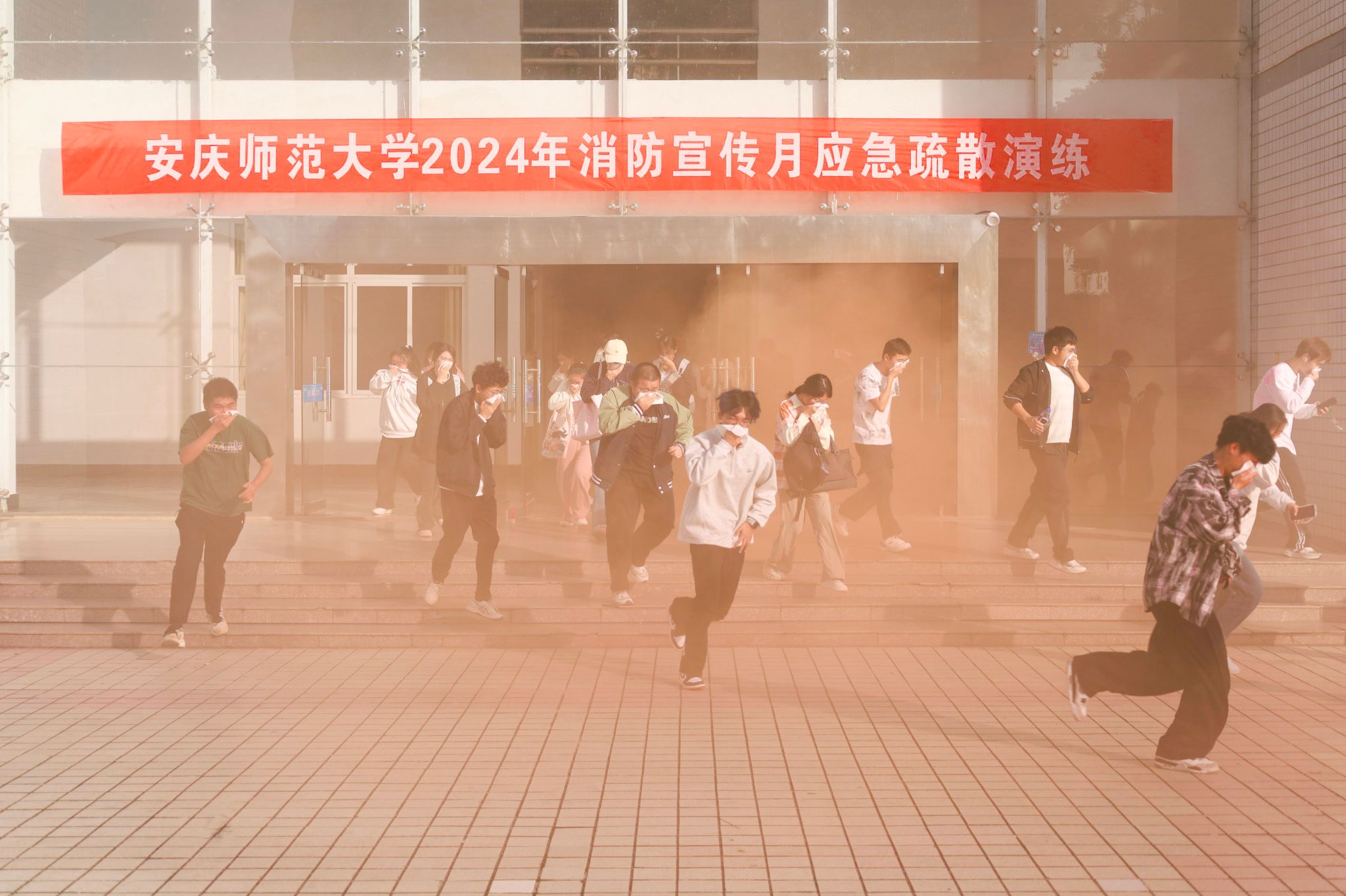 当第一声警报响起,各班级辅导员迅速组织学生紧急避震,同学们迅速抱头,用双手保护头颈,蜷曲身体,降低身体重心,躲在课桌下或教室内墙角处。30秒后,立即进入火灾疏散演练环节,同学们低头弯腰,穿过浓烟弥漫的“火场”,按照疏散路线依次、快速撤离到广场。“只见浓烟滚滚,场面令人震撼,我真真切切地感受到了火灾的危险与逃生的紧迫。通过这样的演练,以后无论在家还是在校,倘若真的出现火情,我坚信自己一定能够冷静应对。”生命科学学院石旌男同学说到。学生校卫队董康宁同学参与火灾疏散引导,她表示,“为尽量还原火场的情况,我们在楼道处、出口处释放了消防演习烟雾弹。我们在各楼梯口引导同学们有序疏散,各小组密切协作,整个演练过程做到了安全、快速、有序。”