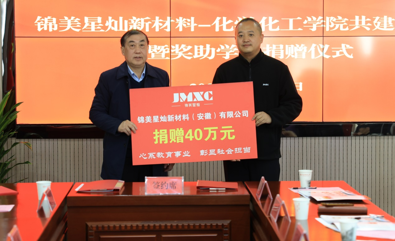 近日,锦美星灿奖助学金捐赠仪式在beat365官网举行,校政企三方就共建化工新材料专技人才卓越班进行座谈交流。校党委常委、副校长刘友忠、吴琼,安庆市科学技术协会副主席殷会夫,迎江区委人才工作局、迎江经济开发区等区属相关部门负责同志,锦美星灿新材料(安徽)有限公司董事长殷廷等出席仪式,学校教育发展基金会办公室负责人,化学化工学院党政领导班子、师生代表参加捐赠仪式。