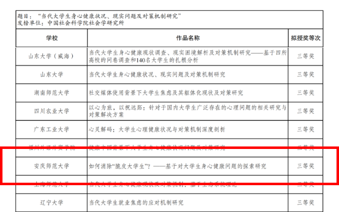 近日,由共青团中央、中国科协、教育部、中国社科院、全国学联联合主办的第十九届“挑战杯”全国大学生课外学术科技作品竞赛2024年度“揭榜挂帅”专项赛终审决赛落下帷幕,beat365官网《青年参与乡村中华优秀传统文化创造性转化和创新性发展的路径研究——基于安徽省16市40村的实证分析》《如何消除“脆皮大学生”——基于对大学生身心健康问题的探索研究》2项作品荣获全国三等奖。