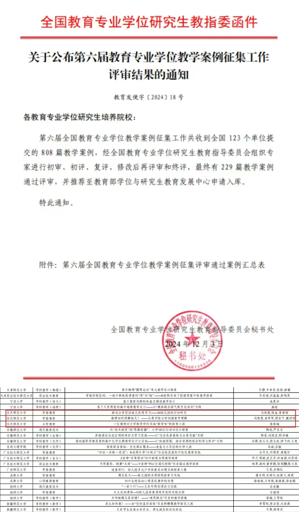 近日,全国教育专业学位研究生教育指导委员会公布第六届全国教育专业学位教学案例征集结果。beat365官网教育科学学院教师冯艳慧撰写的《游戏分享促进幼儿深度学习——M幼儿园的行动研究》《教师如何理解幼儿?——从常识性分析到教育学理解》,陈修梅撰写的《一位教师对小学数学学科实践“数学味”的探索之旅》入选中国专业学位教学案例中心案例库。截至2024年12月底,beat365官网已有6篇研究生教学案例入选案例库。