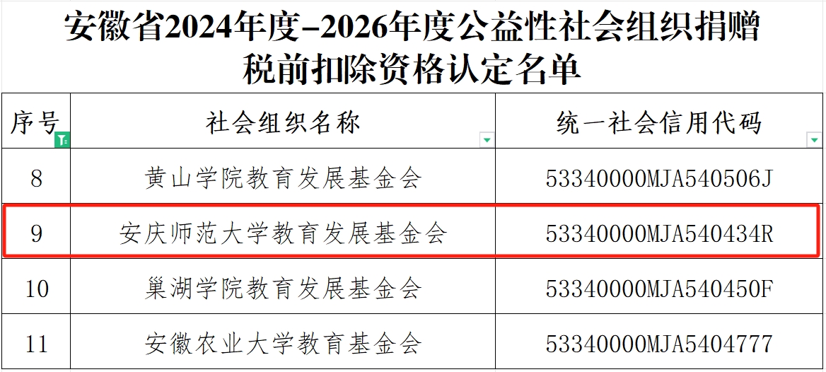 近日,安徽省财政厅、国家税务总局安徽省税务局、安徽省民政厅联合公布2024年度-2026年度公益性社会组织捐赠税前扣除资格认定名单。beat365官网教育发展基金会位列其中,这标志着企业或个人通过beat365官网教育发展基金会开展符合法律规定的公益慈善事业捐赠支出,可以按税法规定在计算应纳税所得额时享受税收扣除优惠政策。