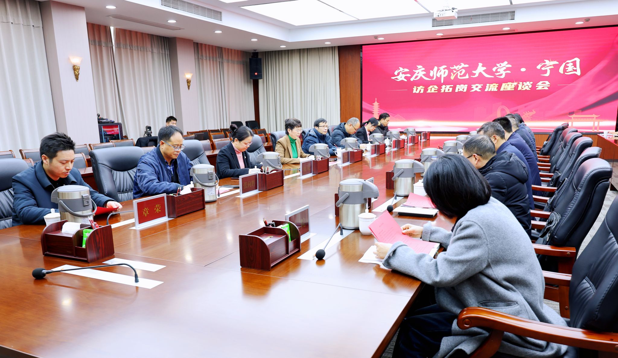 在宁国市,校地双方召开交流座谈会。宣城市委组织部副部长、市委人才工作局局长陈俊炎,宁国市委常委、组织部部长屠春节,宁国市政协副主席、市工商联主席李汉林,安徽材料工程学校党委书记韩亮及宁国市人社局、教体局、司法局、科技局、公检法机关、宁国中学、中鼎集团等近20家机关、企事业单位负责人参加座谈。
