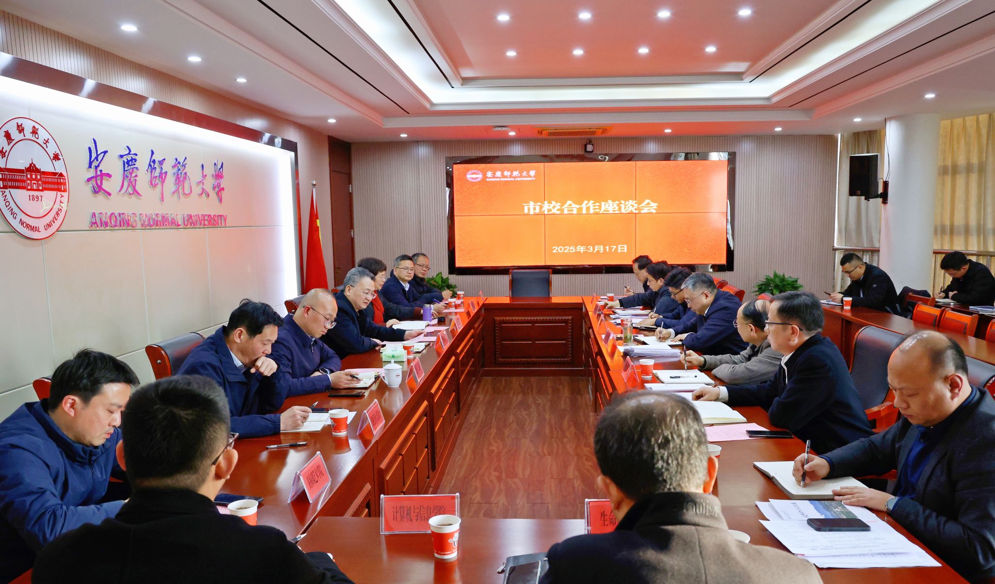 3月17日,安庆市委副书记廖强率队来校开展市校合作交流。校党委书记李福华,校长彭凤莲,校党委常委、副校长肖新出席座谈会。安庆市委副秘书长曹金陵,市委办公室、市委宣传部、社会工作部、人才工作局、教体局和学校发展规划处、服务经济社会发展处、法学院、黄梅剧艺术学院、计算机与信息学院、生命科学学院等单位负责人参加会议。