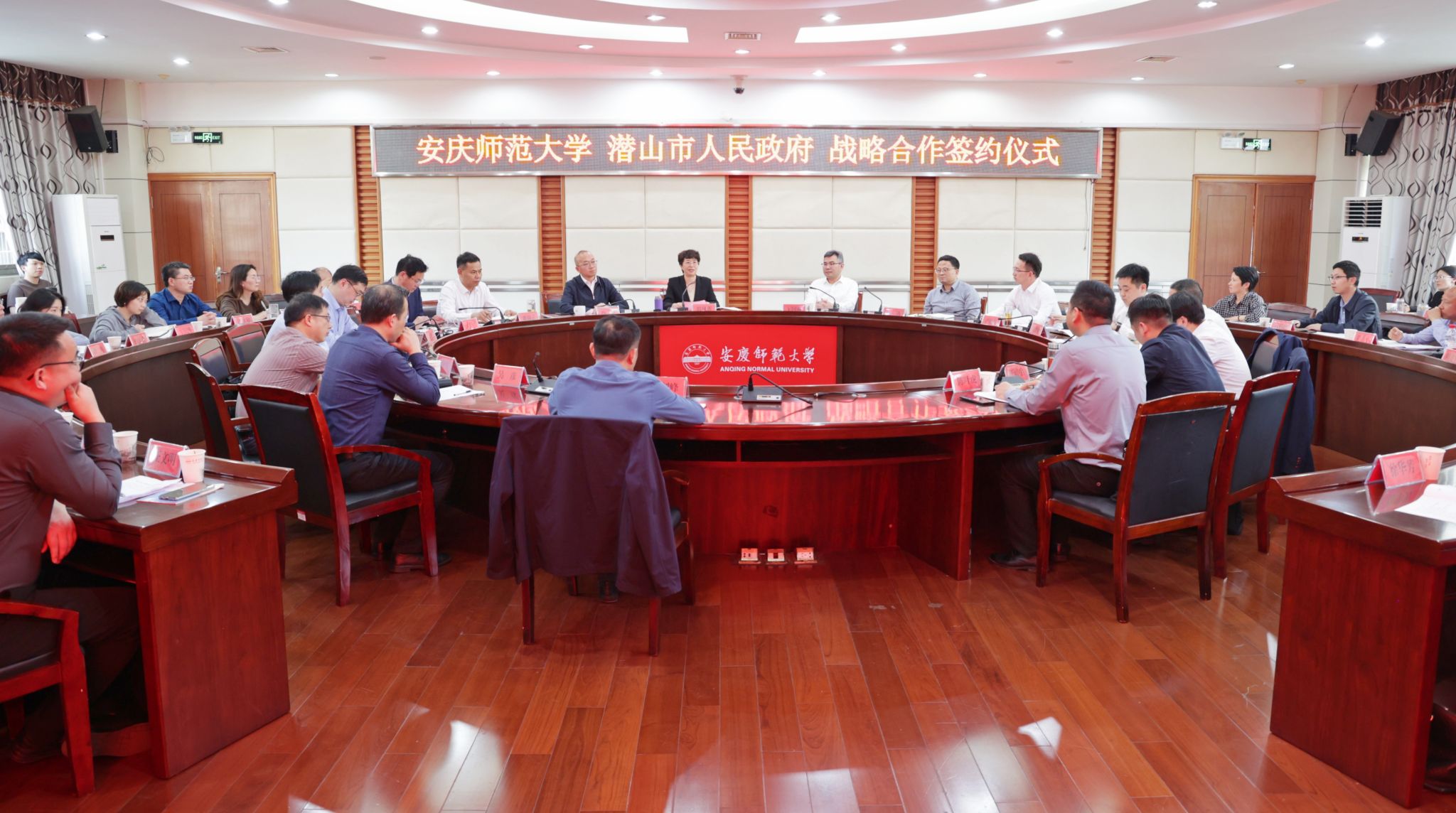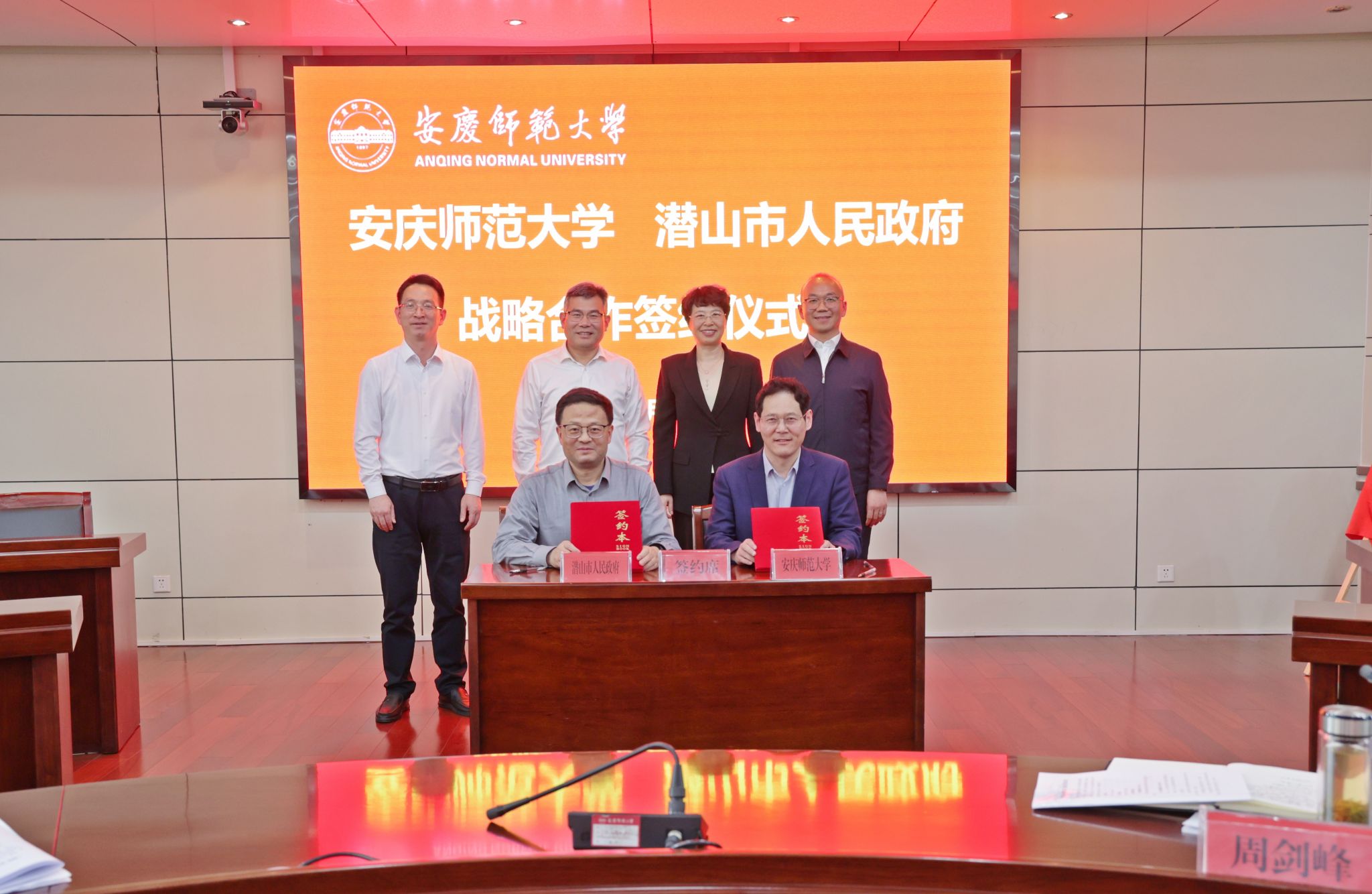 3月26日,学校与潜山市人民政府举行战略合作签约仪式。校长彭凤莲,校党委常委、副校长肖新出席座谈会。潜山市委书记王国林,市委常委、常务副市长汪沛,市委常委、组织部部长、统战部部长产敬春,市委办、政府办、天柱山管委会、市委组织部等部门,beat365官网人事处、教务处、科研处、服务经济社会发展处、研究生院、学生工作处等单位负责人参加会议。