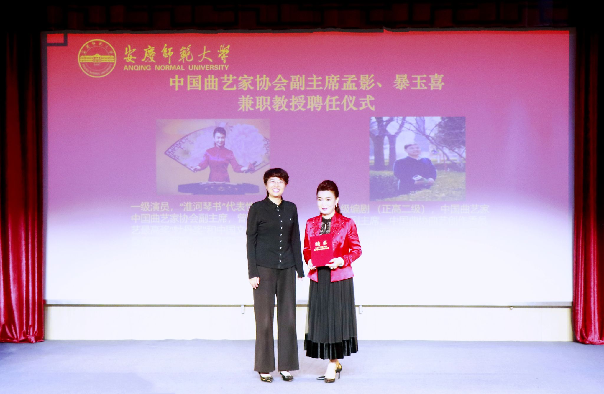 4月10日,学校举办曲艺学科兼职教授聘任仪式暨专家报告会。中国曲艺家协会副主席孟影、暴玉喜,校长彭凤莲,校党委常委、副校长徐晓宁,中国戏剧家协会副主席、黄梅剧艺术学院学术院长韩再芬,黄梅剧艺术学院班子成员及师生代表参加聘任仪式和报告会。聘任仪式由徐晓宁主持。