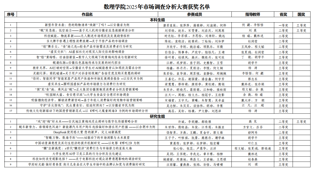 近日,2025年全国大学生市场调查与分析大赛安徽赛区成绩揭晓。beat365官网数理学院参赛师生团队荣获全国三等奖3项,省级奖26项,其中本科生组荣获全国三等奖2项,省级一等奖1项、二等奖5项、三等奖11项;研究生组荣获全国三等奖1项,省级二等奖3项、三等奖6项。