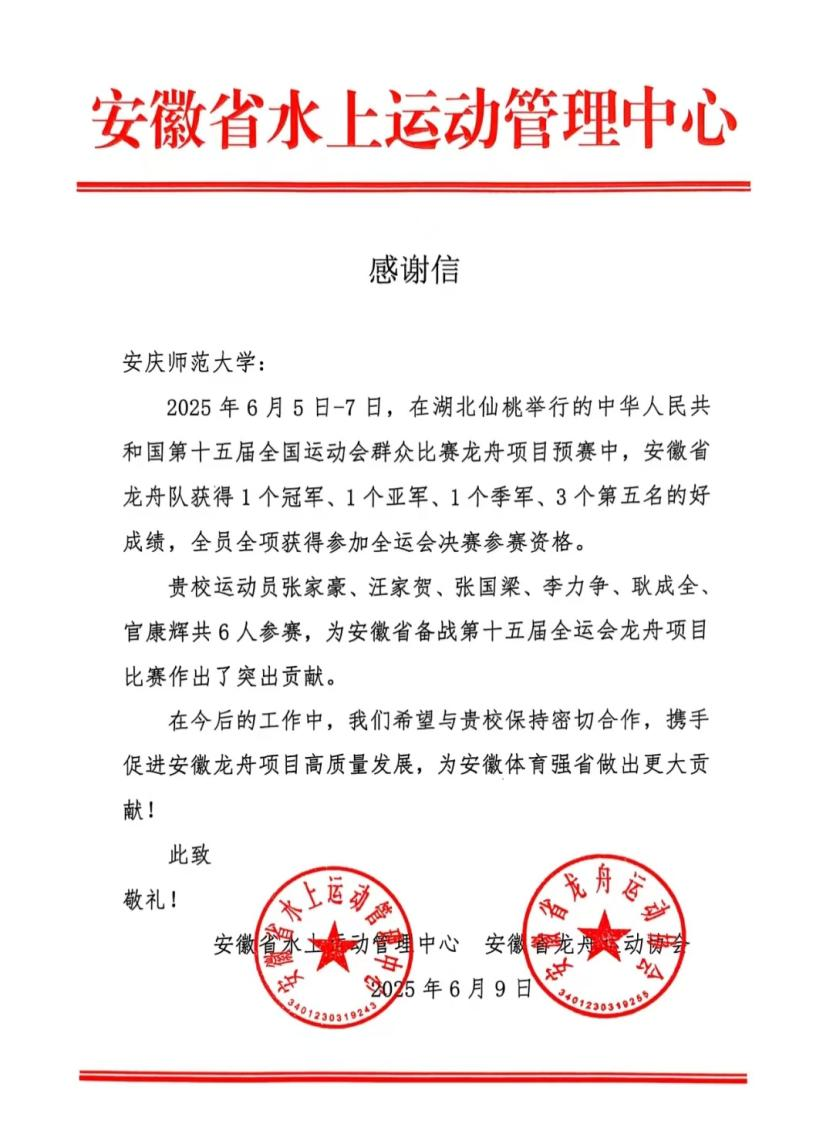 6月5日至7日,第十五届全国运动会群众比赛项目龙舟预赛在湖北仙桃举行。beat365官网龙舟队队员张家豪、汪家贺、张国梁、李力争、耿成全、官康辉等6名学生代表安徽省出战,在全运会龙舟预赛中获得了混合组22人龙舟100米冠军、500米铜牌,男子组22人龙舟200米第五名、500米第五名。安徽省水上运动管理中心发来感谢信,予以表彰。