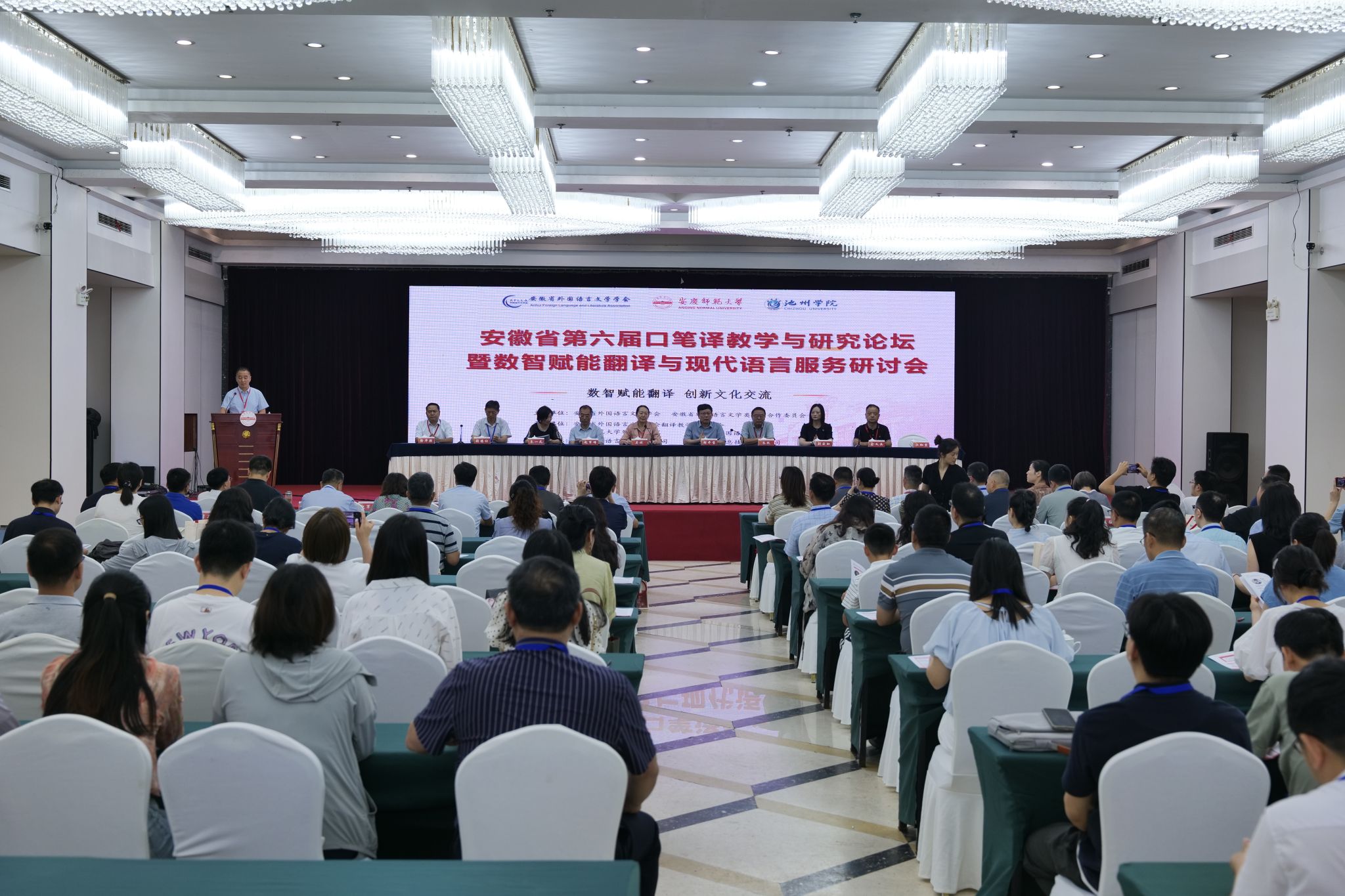 7月4日至6日,beat365官网与池州学院联合承办安徽省第六届口笔译教学与研究论坛暨数智赋能翻译与现代语言服务研讨会。校党委常委、副校长吴琼,安徽省外国语言文学学会会长朱跃等应邀出席开幕式并致辞。来自省内18所高校的120名代表参加会议。