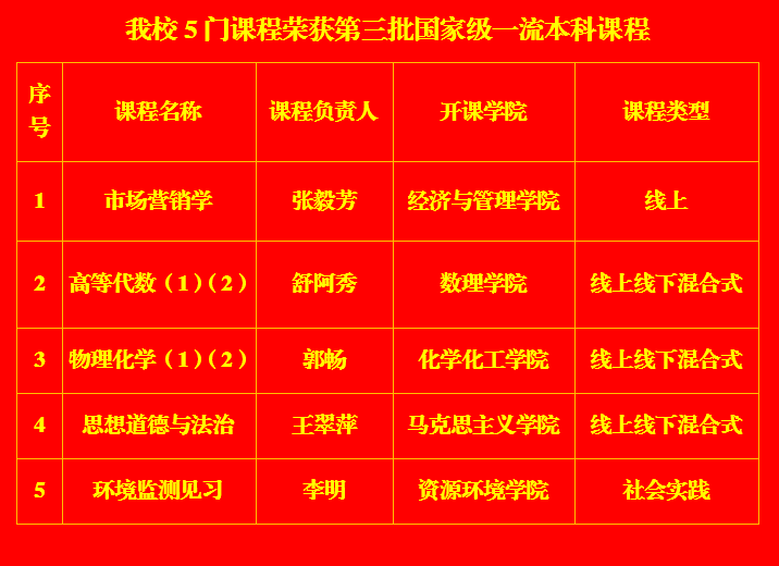 近年来,学校始终坚持“学生中心、产出导向、持续改进”理念,全面开展一流本科课程建设,深入推进课程改革创新,严格做好课程建设管理,逐步形成了多类型、多样化的课程体系和教学内容。此次5门课程入选国家级一流本科课程,充分体现了学校在课程质量提升和教学模式创新方面的显著成效。