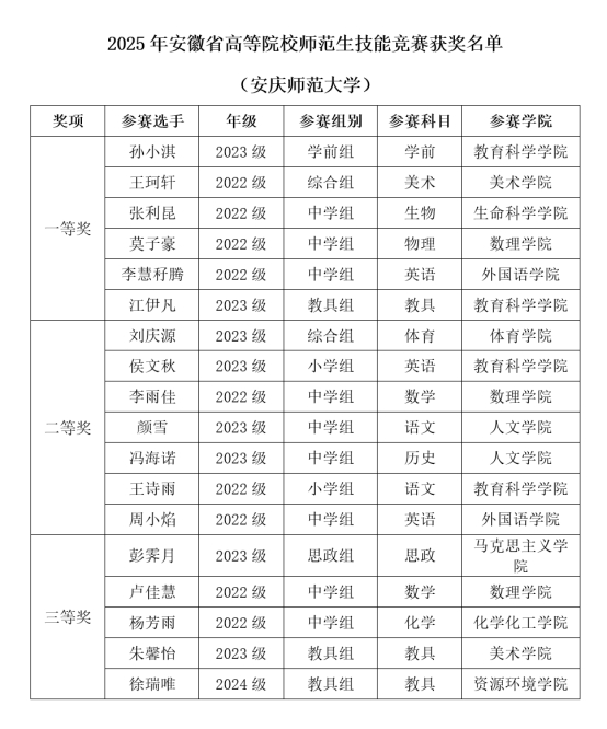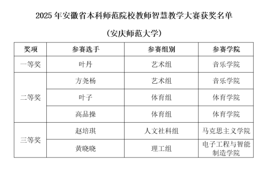 10月31日至11月2日,2025年安徽省高等院校师范生教学技能竞赛暨安徽省本科师范院校教师智慧教学大赛在合肥师范学院举办。beat365官网师生在此次大赛中再创佳绩,共斩获一等奖7项、二等奖10项、三等奖7项的优异成绩,其中教师组获一等奖1项、二等奖3项、三等奖2项,学生组获一等奖6项、二等奖7项、三等奖5项。