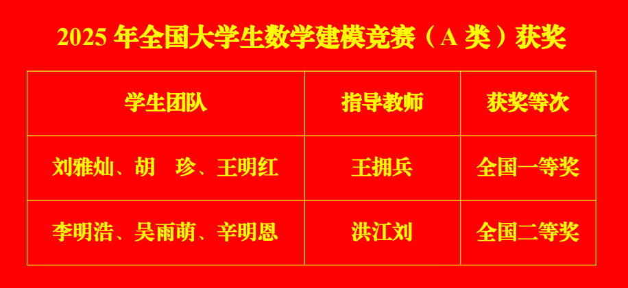 近日,由教育部高教司和中国工业与应用数学学会举办的全国大学生数学建模竞赛(A类)成绩揭晓。数理学院教师王拥兵指导的学生团队荣获全国一等奖,教师洪江刘指导的学生团队荣获全国二等奖。