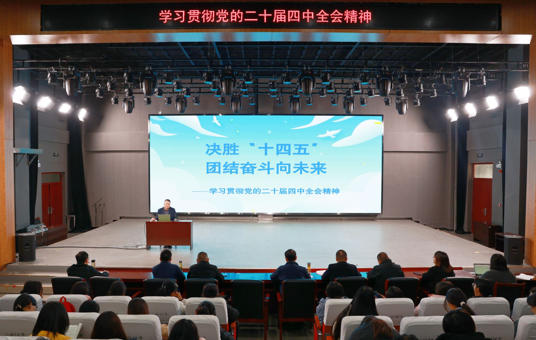 12月10日,学校举行党的二十届四中全会精神宣讲暨形势政策报告会。校党委书记李福华作题为《决胜“十四五” 团结奋斗向未来——学习贯彻党的二十届四中全会精神》专题报告。学校办公室党支部全体成员,外国语学院、教育科学学院师生代表,小学教育专业2025级1、2班,法学专业2025级1、2班全体学生参加报告会。