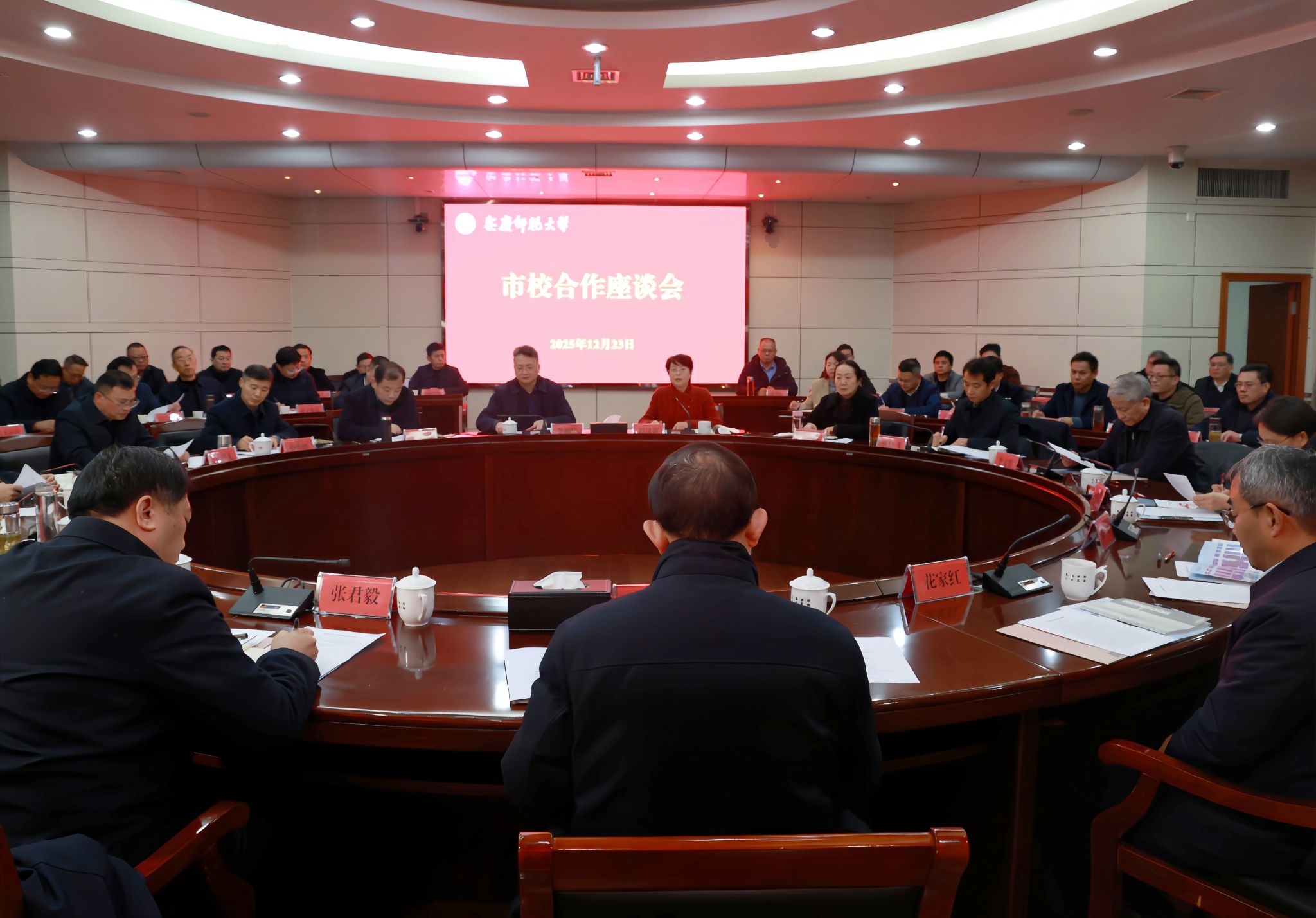 12月23日,安庆市委书记孟景伟率队来校调研,并主持召开市校合作座谈会,安庆市委副书记、市长张君毅,校党委书记李福华、校长彭凤莲参加。安庆市领导花家红、周建春、徐雄、梁龙义、刘婉贞、章洪海、李文胜,校领导崔明、吴琼、申传胜,校党委常委张红飞、计裕人出席会议。