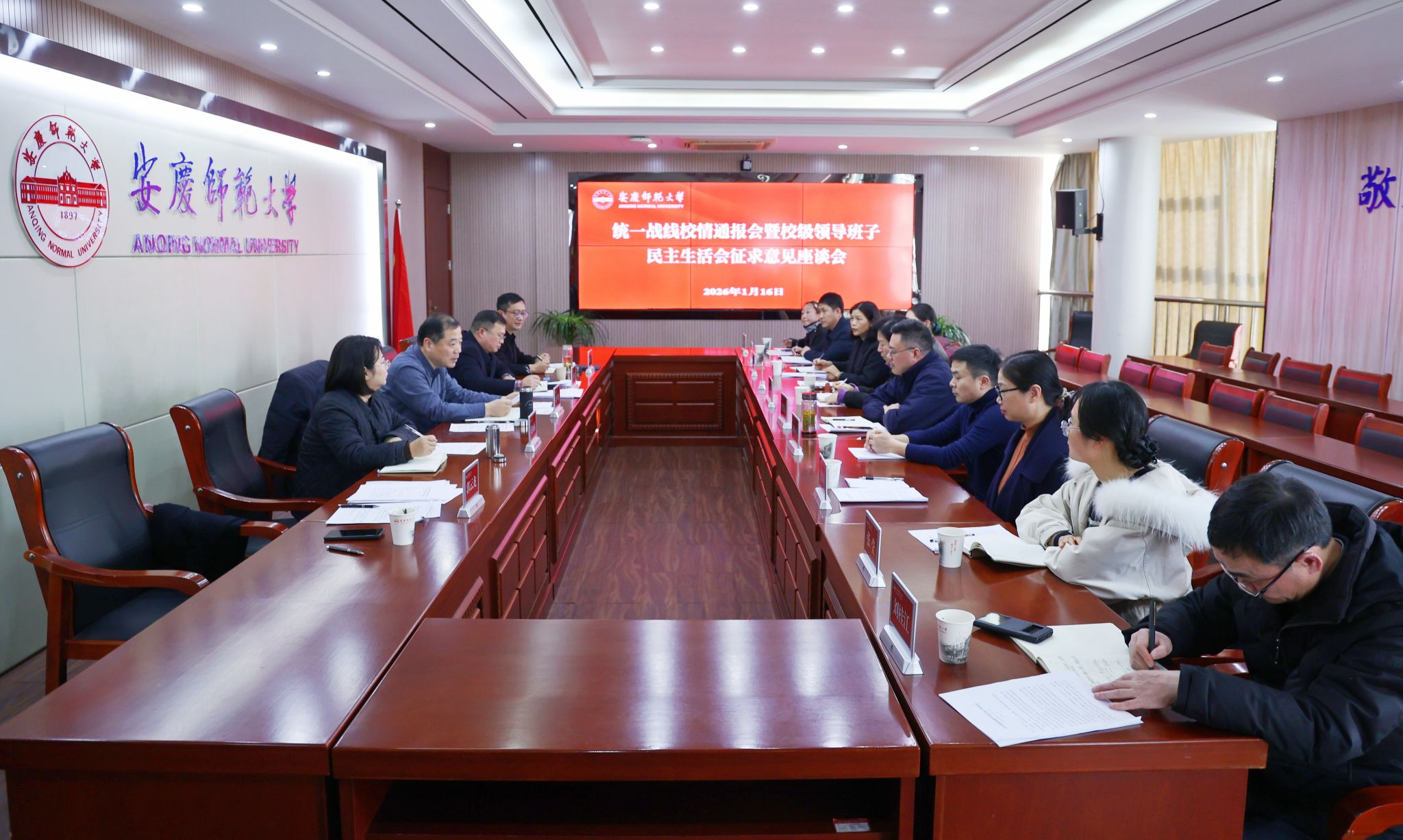 1月16日,学校召开2025年度统一战线校情通报会暨校级领导班子民主生活会征求意见座谈会。校党委副书记崔明,校党委常委、党委组织部常务副部长计裕人出席会议。党委统战部负责人,民主党派师大支部(社)负责人、代表,校知联会和侨留联负责人等参加会议。