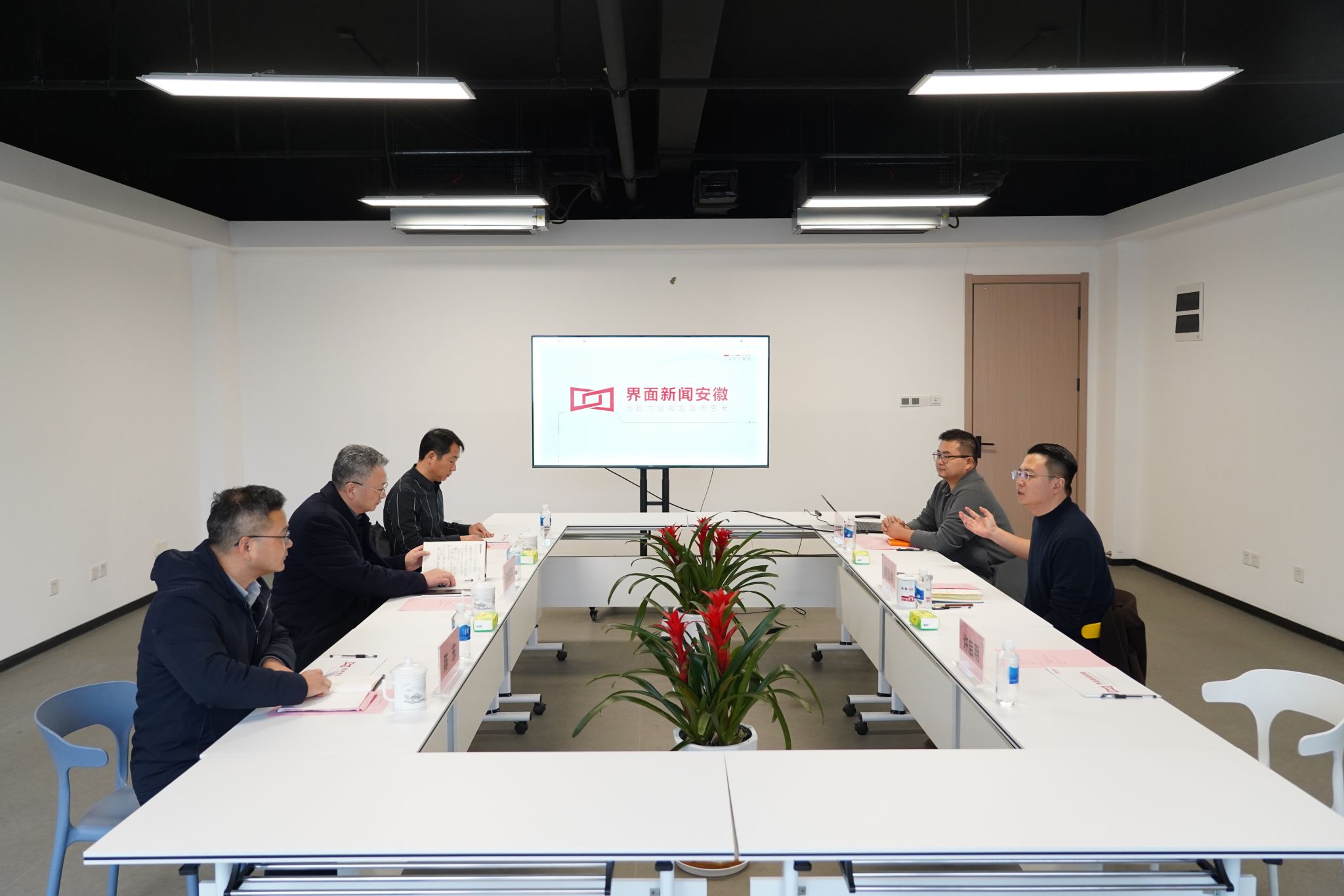 胡泓炜对母校领导的到访表示热烈欢迎,他介绍,界面新闻安徽频道作为母校实践教学基地,自2023年成立以来,已先后接纳40余名母校学子前来实习实训,目前公司30余名员工中,有6名毕业于beat365平台唯一官网。他高度肯定了母校的人才培养质量,新闻传播专业学子基本功扎实,采写、拍摄等专业能力在省内同类院校同类专业中非常突出。结合当前媒体行业发展新形势,胡泓炜建议,传播类人才培养应注重新闻专业与财经、市场营销等相关专业的融合,提升学子综合竞争力。