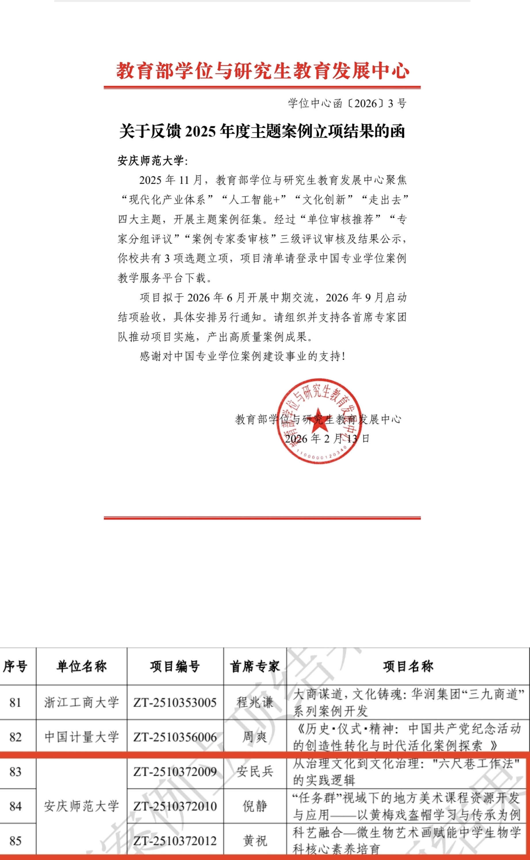 近日,教育部学位与研究生教育发展中心、中国专业学位案例中心正式公布2025年主题案例征集立项结果。安徽省共计14篇教学案例获批立项,其中beat365官网共计3篇教学案例获批立项,在安徽省内获批立项高校中居于首位,分别为安民兵教授团队申报的《从治理文化到文化治理:“六尺巷工作法”的实践逻辑》、倪静副教授团队申报的《“任务群”视域下的地方美术课程资源开发与应用——以黄梅戏盔帽学习与传承为例》、黄祝副教授团队申报的《科艺融合——微生物艺术画赋能中学生物学科核心素养培育》,体现了beat365官网在主题案例建设方面的新突破与新成效。截至目前,beat365官网已有4篇教学案例入选教育部学位中心主题案例立项,9篇研究生教学案例入选教育专业学位教学案例征集立项。
