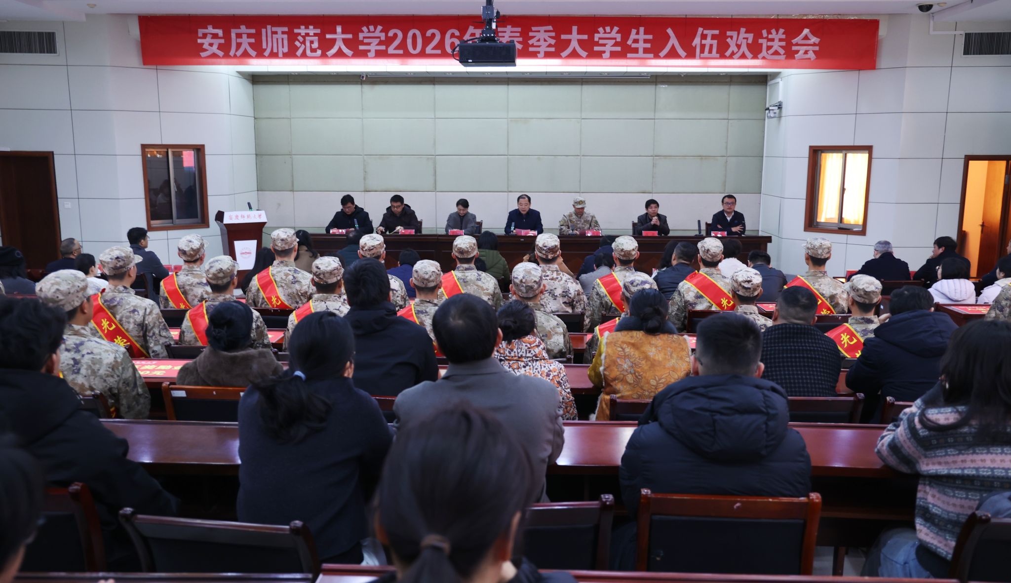 2026年春季大学生入伍欢送会在行政楼一楼会议室举行。校党委副书记崔明代表学校致辞,他希望,入伍新兵铸牢忠诚之魂,坚定理想信念;锤炼胜战之能,苦练过硬本领;坚守品行之范,传承校训精神;勇担时代之责,书写青春华章。他表示,军营是淬炼成长的新战场,母校永远是学生们最坚强的后盾,期待新兵捷报频传、载誉归来。