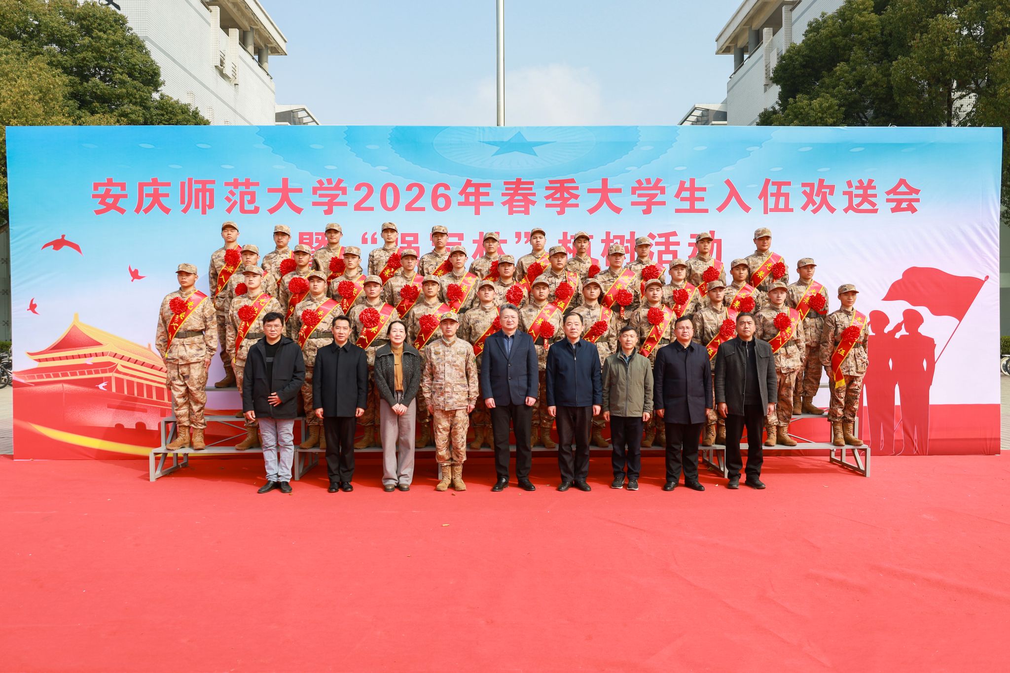 3月12日,学校举行2026年春季大学生入伍欢送会暨“强军林”植树活动。校党政领导李福华、崔明、吴琼、申传胜、张红飞、计裕人,大观区人民武装部聂竹青出席活动。教务处、研究生院、学生处、安全管理处、基建与后勤管理处、团委等相关部门负责人,各学院分管学生工作书记、征兵专管教师、辅导员代表,全体春季入伍大学生及学生家长代表参加活动。