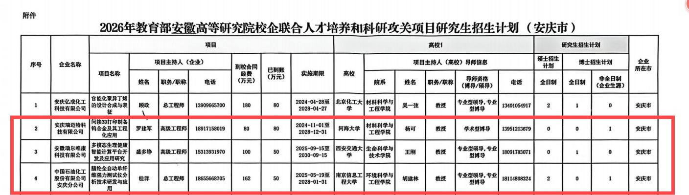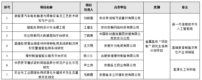 学校7个科研团队获批省教育厅“项目制”研究生培养计划,紧密对接安徽“1188”现代化产业体系,分布于新一代信息技术与人工智能、高端装备制造、能源化工材料三大领域,项目依托安庆帝伯格茨活塞环有限公司等7家企业开展,着力推动高层次人才供给、关键技术攻关与科技成果转化一体化发展。